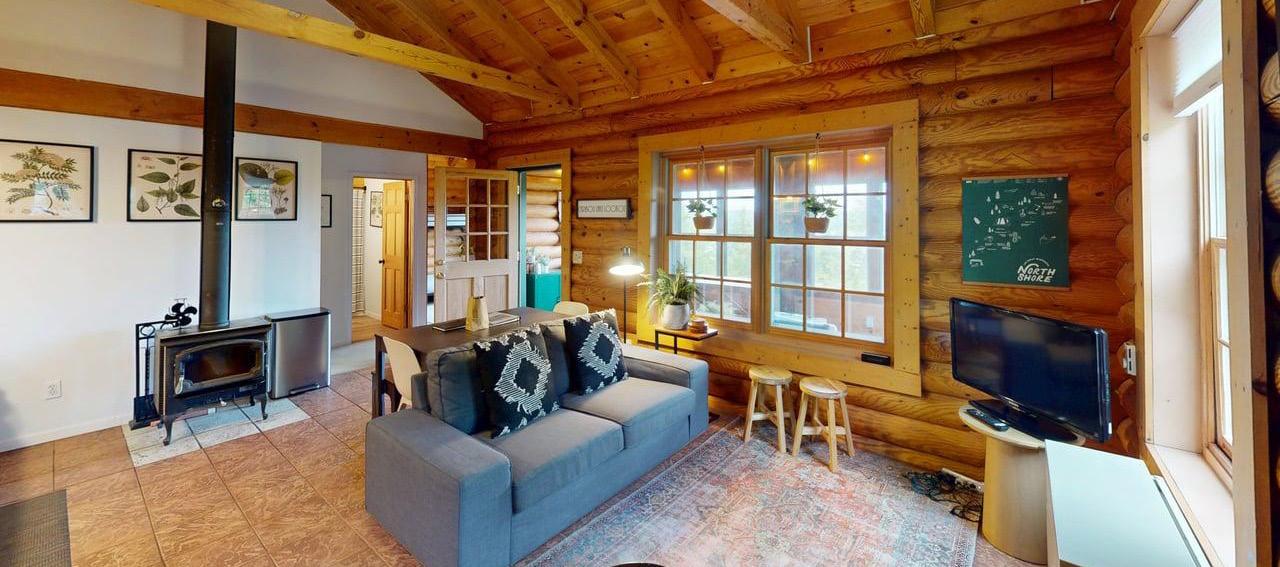 The “Little Lost Containers” has been crafted with skill to create a unique vacation rental. Situated on a ridge above Lake Superior, it captures magnificent views. It is all about the view with each room, 3 levels of decks, and the fire circle providing a place to soak in the beauty. Living room includes custom-made furniture that converts to a 2nd bed and the efficient kitchen provides everything for a relaxing stay.