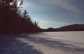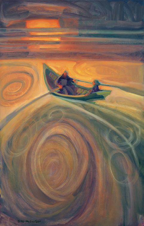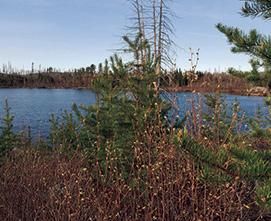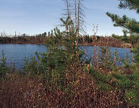 edge of a muskeg swamp before reaching the water’s edge. With rubber boots and walking sticks, we soldiered on into the bog, poking at the bottom in hopes of finding the canoe. It was unmistakable when the stick hit the solid mass about two feet under the murky water. I could feel the shape of the canoe, but the hollow was mostly filled with muskeg; so I