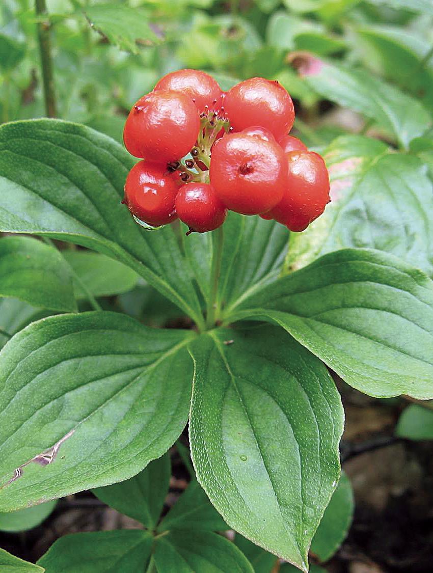 [ABOVE] When bunchberry’s complex pollen release system works, the plants produce a cluster of brilliant red berries that are edible for both animals and humans. | EMILY STONE