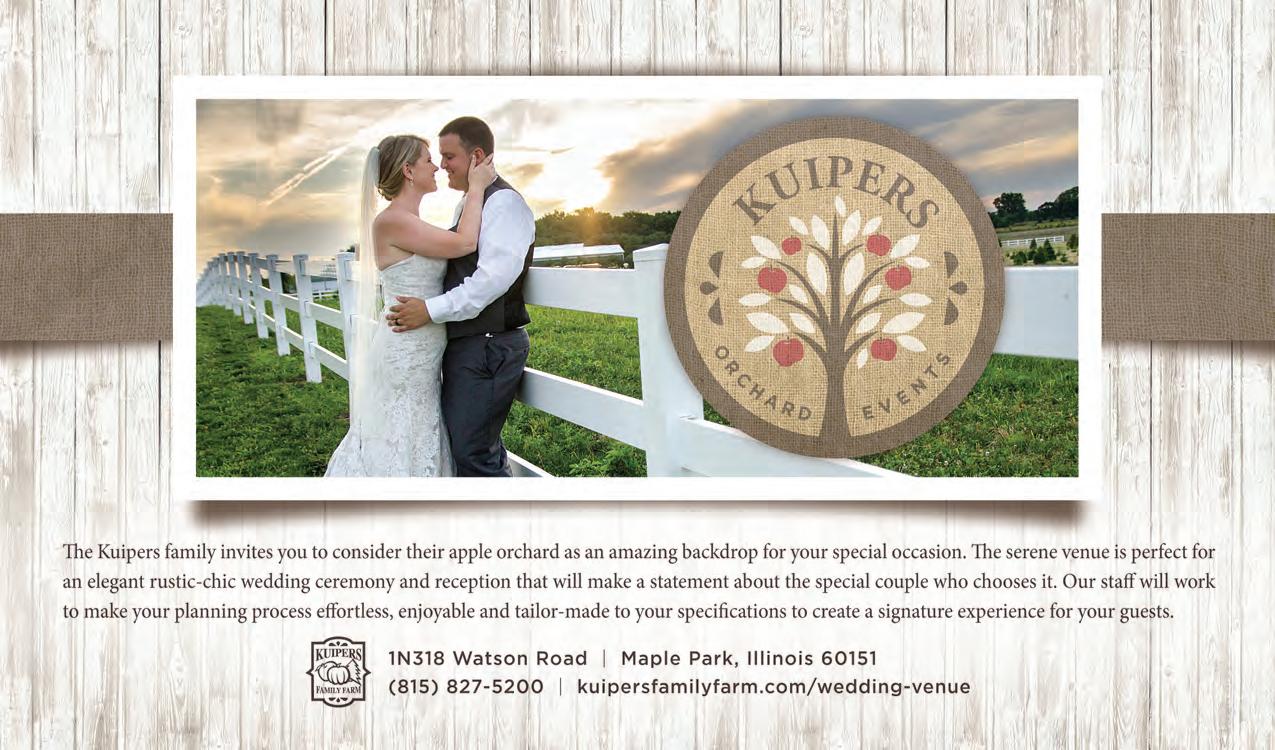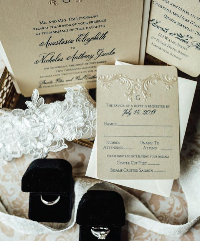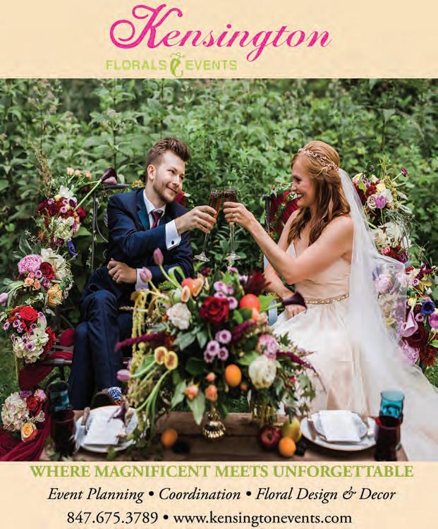 Don’t forget to have fun during the planning process! Dress shopping can be daunting—try adding a few fun elements, like mimosas or post-shopping dinner, and make it a day out with a few special people. Our bridal gown feature (page 111) was shot on-location at Acquaviva Winery in Maple Park, which served as an absolutely romantic setting for this year’s stunning fashion. From delicate lace ballgowns to sleek beaded sheaths, there’s just so much WOW in this feature!