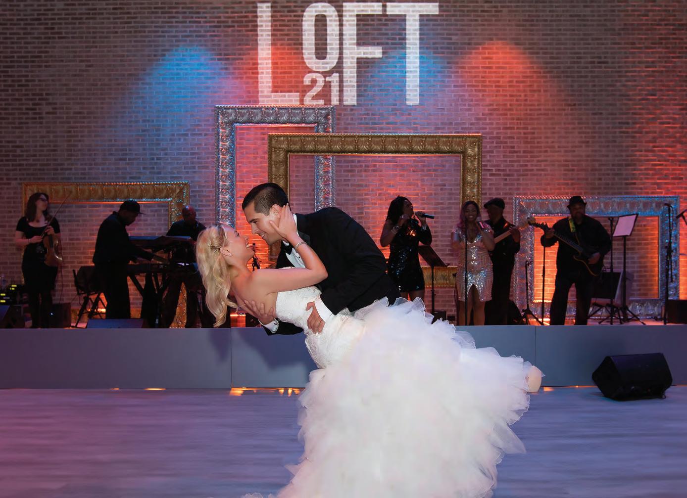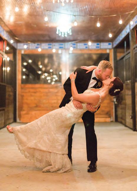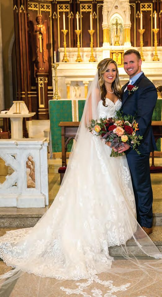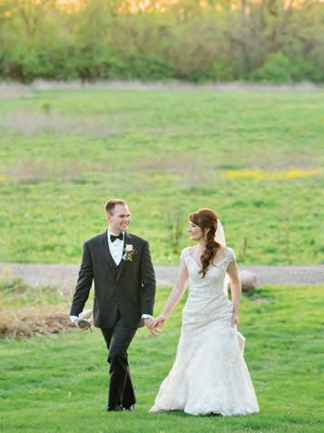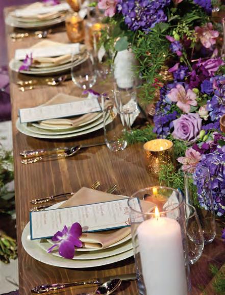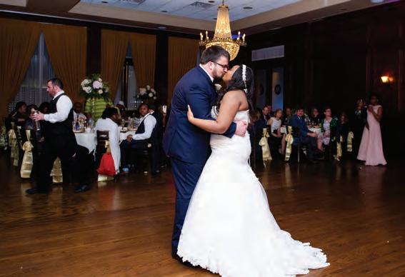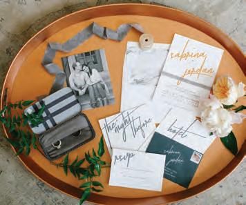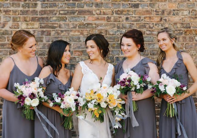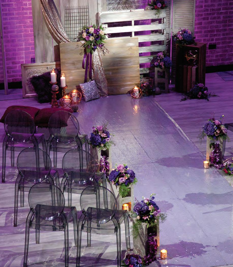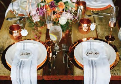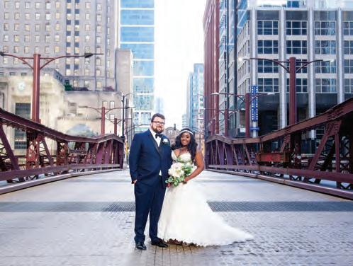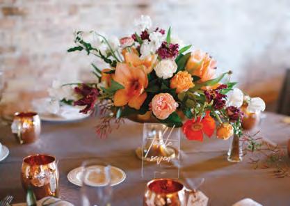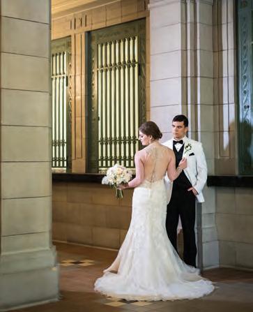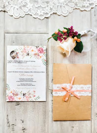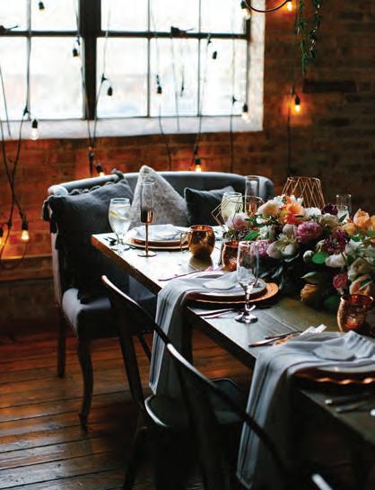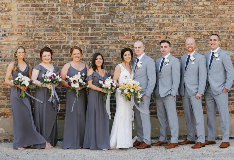 The rustic setting of The Haight was the perfect place for Sabrina and Jordan’s spring wedding. Sprawling greenery and white flowers decorated the wall in a modern twist to the traditional wedding arch. Groomsmen in gray escorted bridesmaids in slate with pops of purple in their bouquets down the aisle. In an elegant lace gown with a bountiful handtied bouquet by Town & Country Gardens, Sabrina made her way to her soonto-be husband knowing that his was the only hand she would hold for the rest of her life. A gorgeous reception awaited them after their vows. String lights hung across the ceiling and brick walls of The Haight, dangling over rustic wooden tables and Tolix chairs. Classic white plates sat atop modern copper chargers, surrounding centerpieces of lush spring flowers with geometric accents. Following a dinner of Lou Malnati’s deep dish pizza, street style tacos and barbecue by My Chef Catering, the newlyweds cut into a marble-esque cake, created by Two Wild Seeds. Sabrina and Jordan shared their first dance under the glow of the string lights before dancing the night away with their guests.