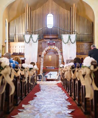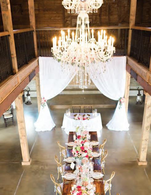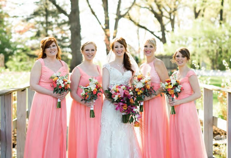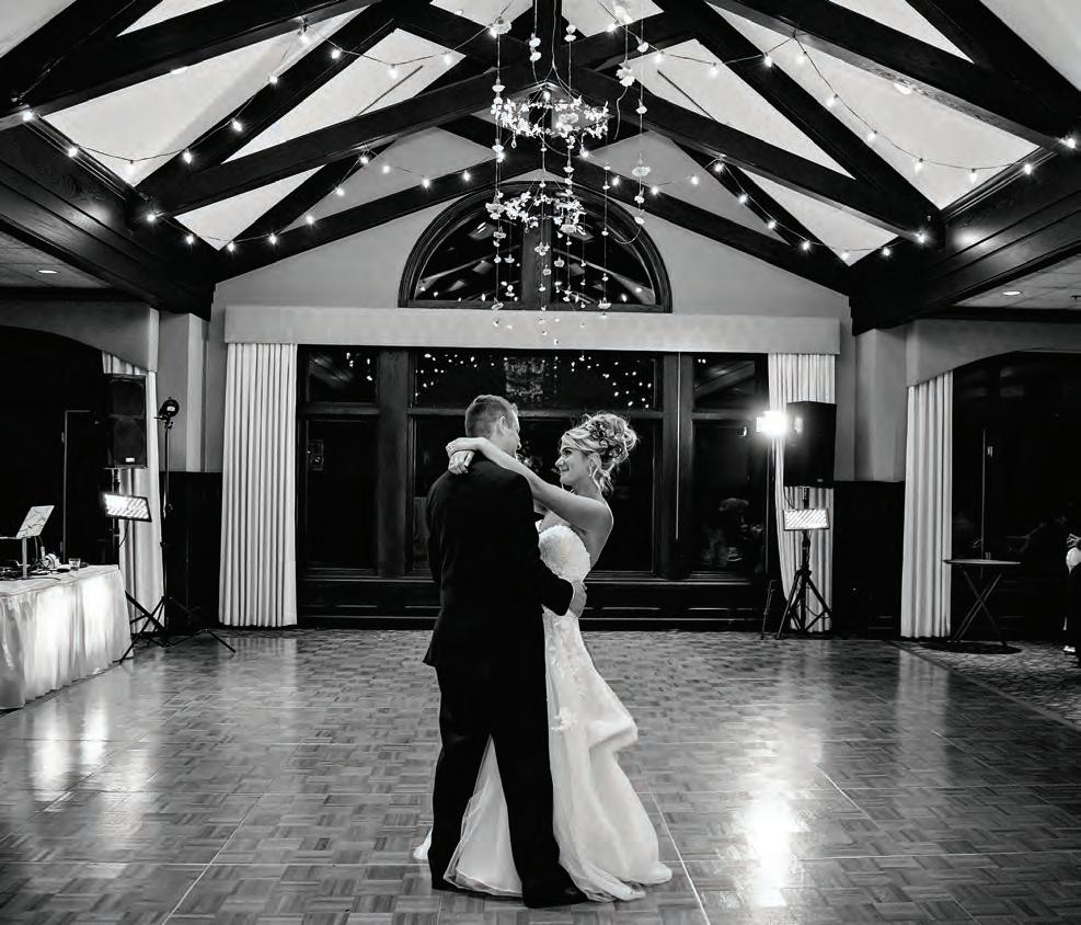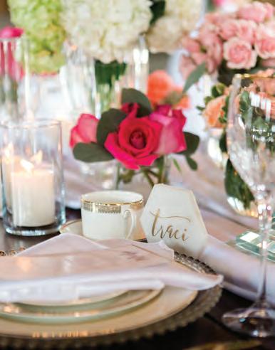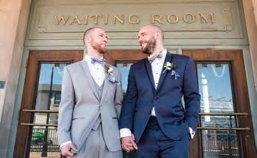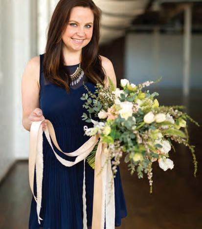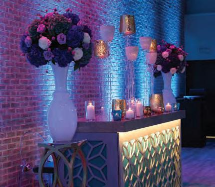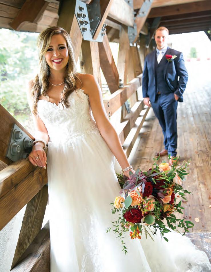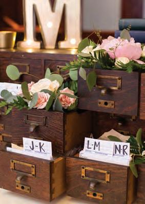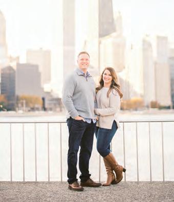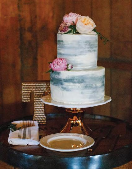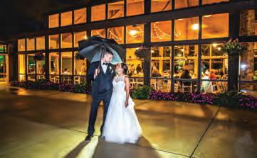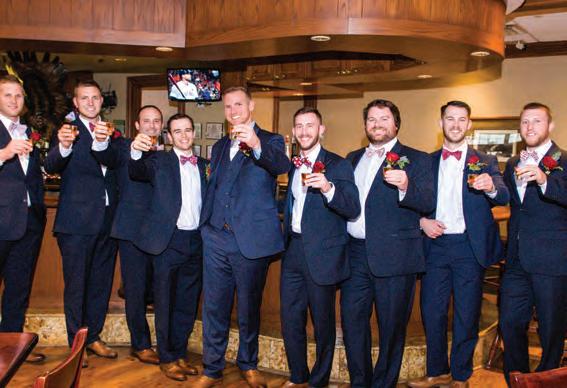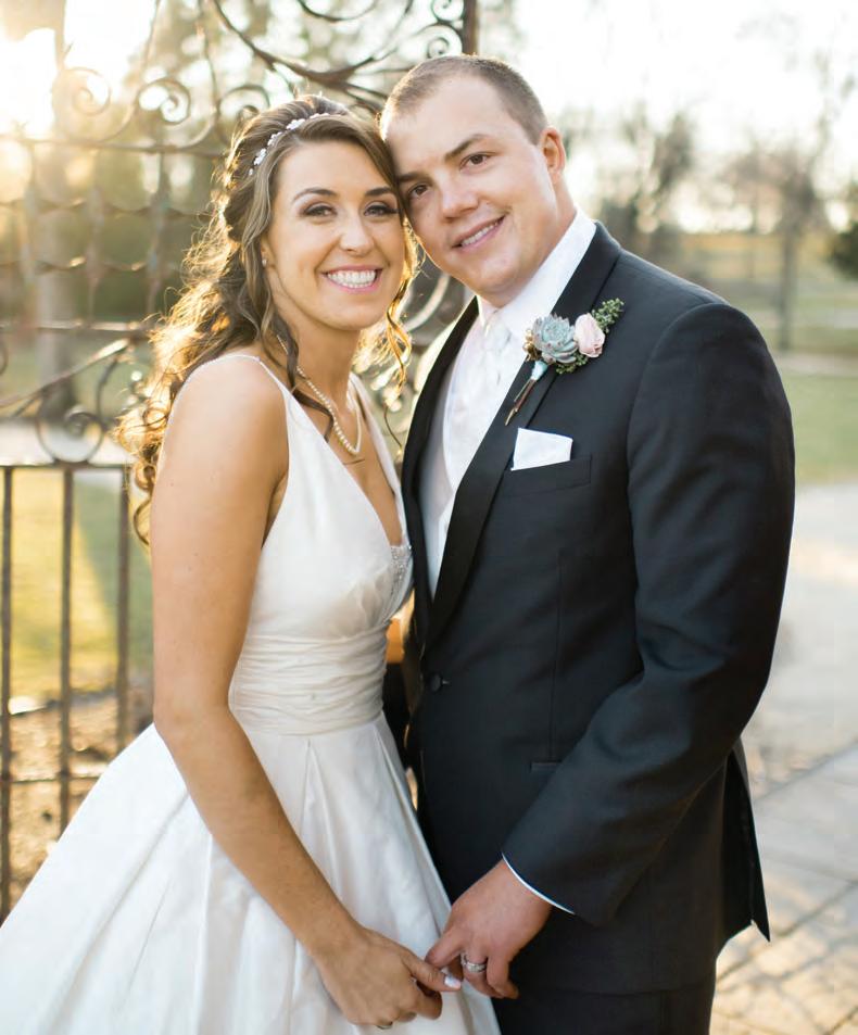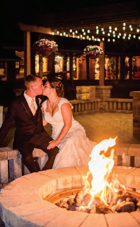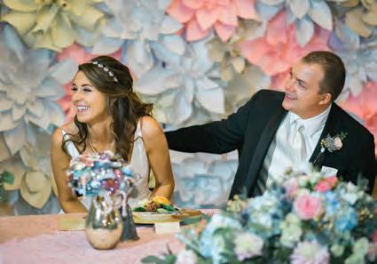 The rustic setting of The Haight was the perfect place for Sabrina and Jordan’s spring wedding. Sprawling greenery and white flowers decorated the wall in a modern twist to the traditional wedding arch. Groomsmen in gray escorted bridesmaids in slate with pops of purple in their bouquets down the aisle. In an elegant lace gown with a bountiful handtied bouquet by Town & Country Gardens, Sabrina made her way to her soonto-be husband knowing that his was the only hand she would hold for the rest of her life. A gorgeous reception awaited them after their vows. String lights hung across the ceiling and brick walls of The Haight, dangling over rustic wooden tables and Tolix chairs. Classic white plates sat atop modern copper chargers, surrounding centerpieces of lush spring flowers with geometric accents. Following a dinner of Lou Malnati’s deep dish pizza, street style tacos and barbecue by My Chef Catering, the newlyweds cut into a marble-esque cake, created by Two Wild Seeds. Sabrina and Jordan shared their first dance under the glow of the string lights before dancing the night away with their guests.