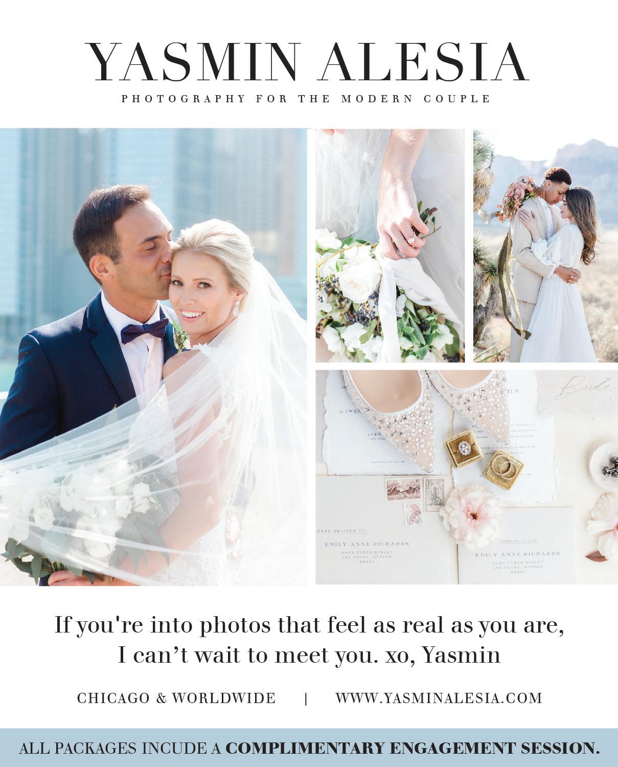 Don’t forget to have fun during the planning process! Dress shopping can be daunting—try adding a few fun elements, like mimosas or post-shopping dinner, and make it a day out with a few special people. Our bridal gown feature (page 111) was shot on-location at Acquaviva Winery in Maple Park, which served as an absolutely romantic setting for this year’s stunning fashion. From delicate lace ballgowns to sleek beaded sheaths, there’s just so much WOW in this feature!