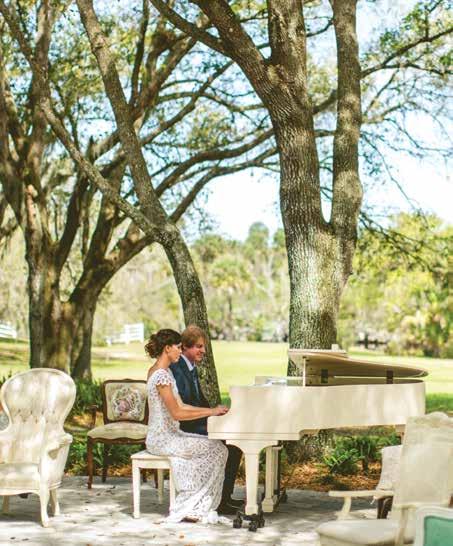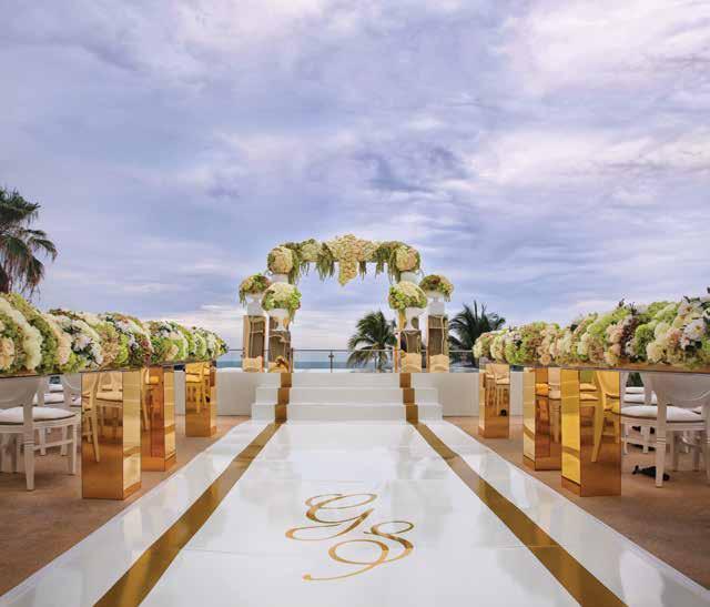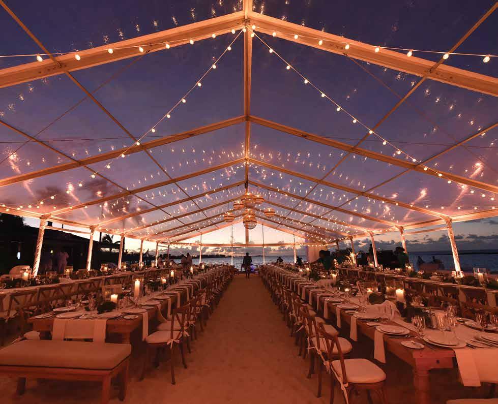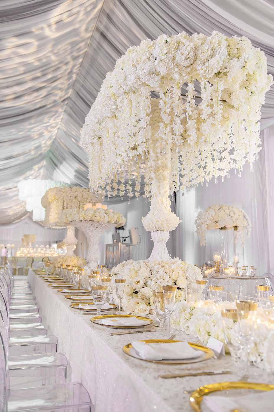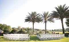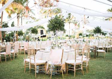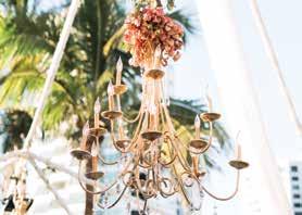 Sarasota seemed to be the perfect destination wedding location for Illinois natives Michelle and Ben. Instead of chilly Midwest weather and rustic autumn colors, the couple enjoyed warm sunshine and a softer palette. In a hand-designed gown by Mira Couture, Michelle made her way down the petal-covered aisle of the Ritz Carlton Beach Club, where her soon-tobe husband stood in front of a beautiful beach scene. She took her place by his side, next to bridesmaids in white and groomsmen in charcoal tuxes. The couple exchanged vows and turned to exit as husband and wife—family and friends showering them with white petals as they passed. After cocktails on the mezzanine, an ethereal outdoor reception awaited them under a frame of white drapery. Gold chandeliers hung elegantly above pale blue luxury linens, gold dinnerware and white flowers in delicate glass vases. The Red Hot Band set a romantic mood during dinner, served by the Ritz Carlton. Later that evening, guests were treated to a spectacular firework display by Zambelli Fireworks, with coordinated music by Mark Joseph Creative. A four-piece bongo band led the celebration into the ballroom, where one last surprise awaited the newlyweds and their guests—a stilt walker that kept the energy going, making for a memorable end to the night.