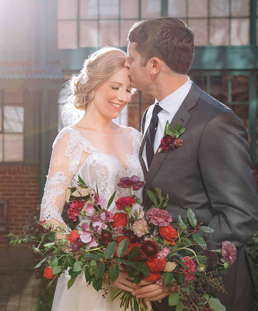 Brick walls, dark floors and bohemian décor in deep jewel tones set a cozy scene for Kara and Matt’s late-winter wedding at the King Plow Arts Center. Organic greenery and a row of glowing candles served as a backdrop for the ceremony. Bridesmaids in navy dresses with embellished necklines and groomsmen in charcoal suits were a polished contrast to the industrial setting. Kara made her entrance in a romantic backless gown with long illusion sleeves by Hayley Paige. Her hand-tied bouquet of deep red and plum strikingly complemented the delicate lace. Surrounded by family and their closest friends, the couple exchanged vows in a personalized ceremony, officiated by Matt’s uncle. An evening of celebration followed. The reception décor included hand-painted stone table markers, tall centerpieces topped with tufts of greenery and vibrant floral, and a wooden estate table lined with candles and wild blooms in a variety of small bottles. Guests enjoyed a buffet dinner and “his and her” desserts of brownie sundaes and crème brulée. Keeping with tradition, the couple cut into a small chocolate cake with Oreo filling, provided by Bold Catering & Design in addition to dessert. After a night of dancing and celebration with loved ones, Kara and Matt exited the venue through cheers and a sea of bubbles.