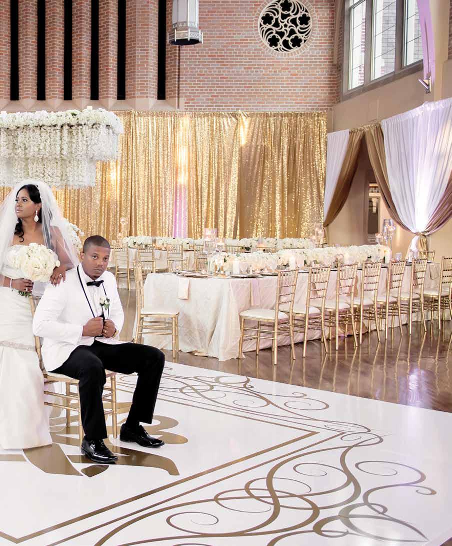 THE DESIGNER SAYS “Let’s face it, who wouldn’t want to dance on a white dance floor with gold elements? Your guests will have never seen this exact dance floor before and will be excited to get the party started! For this wedding, we decided to create this diamond floor plan that not only had the dance floor set on a diamond, but two estate tables in the shape of the diamond as well. Guests were in awe and ready to have fun.”