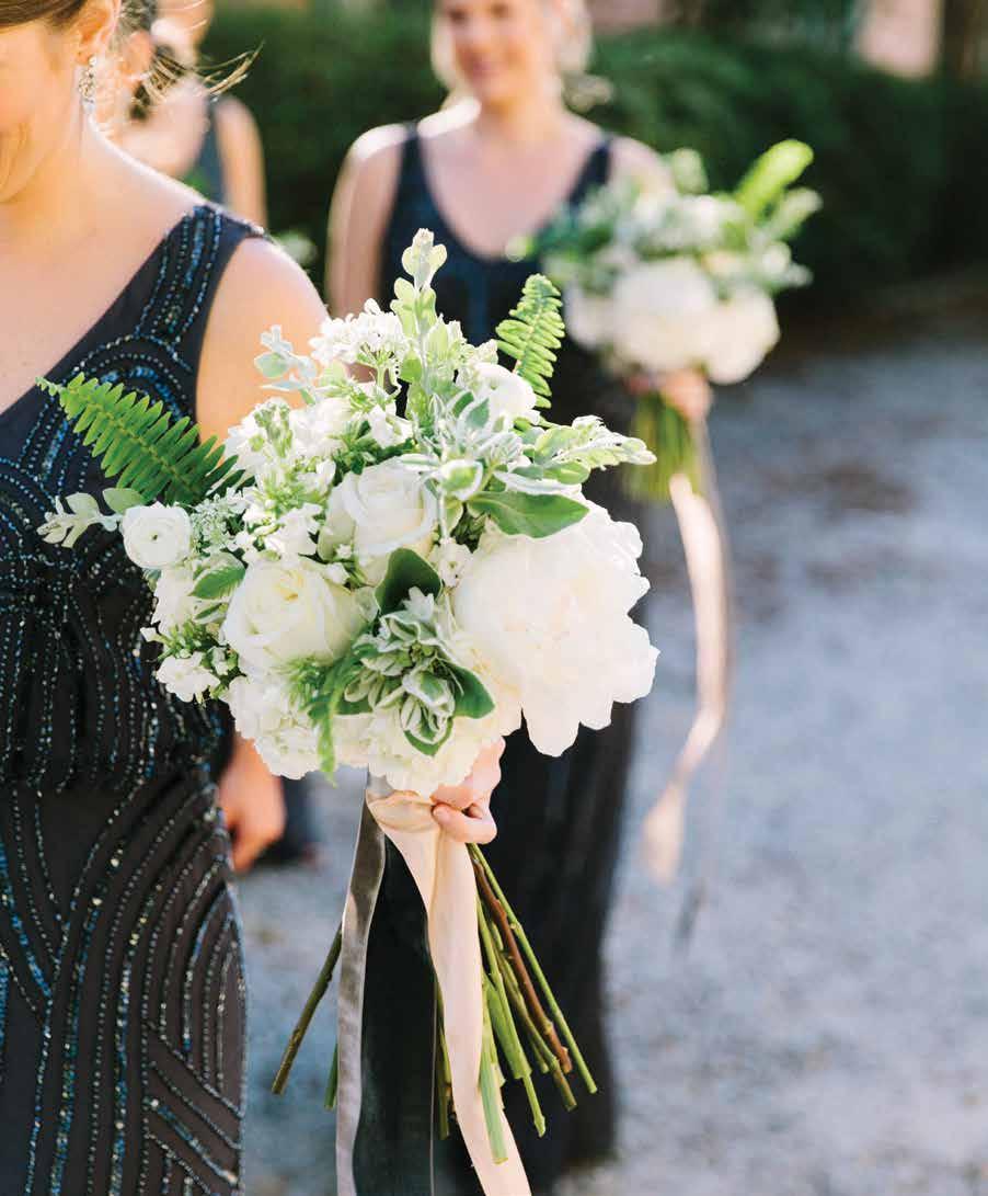 The inspiration was a garden-like bouquet that still had some structure to it and wasn’t terribly loose. Because we knew we wanted to utilize trailing ribbons of different colors and textures, the goal was for them to complement the beaded dresses as opposed to compete with them.