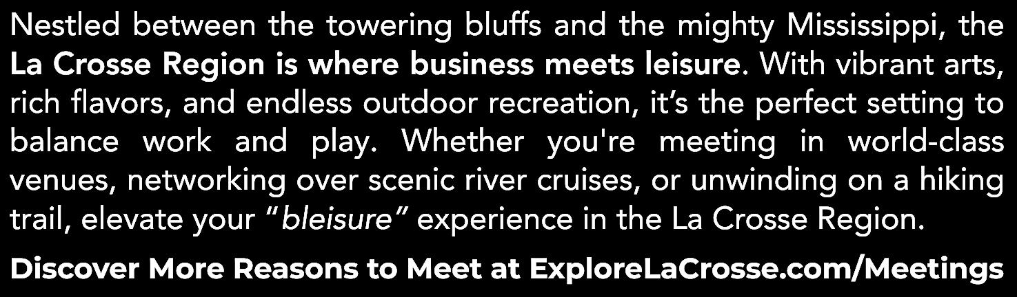For most of us, it doesn’t really feel like spring until the flowers start to bloom. Research shows that inhaling floral fragrances can significantly reduce cortisol levels, the stress hormone that can make us feel anxious or overloaded. So, why not consider hosting your next event in one of Wisconsin’s stunning botanical gardens? “Meetings in Bloom” on page 20 shares that a garden gathering allows teams to escape the boardroom and immerse themselves in nature, fostering creativity and collaboration amidst the flowers.
