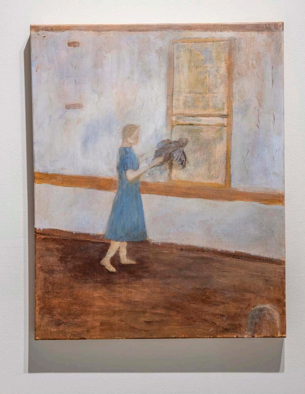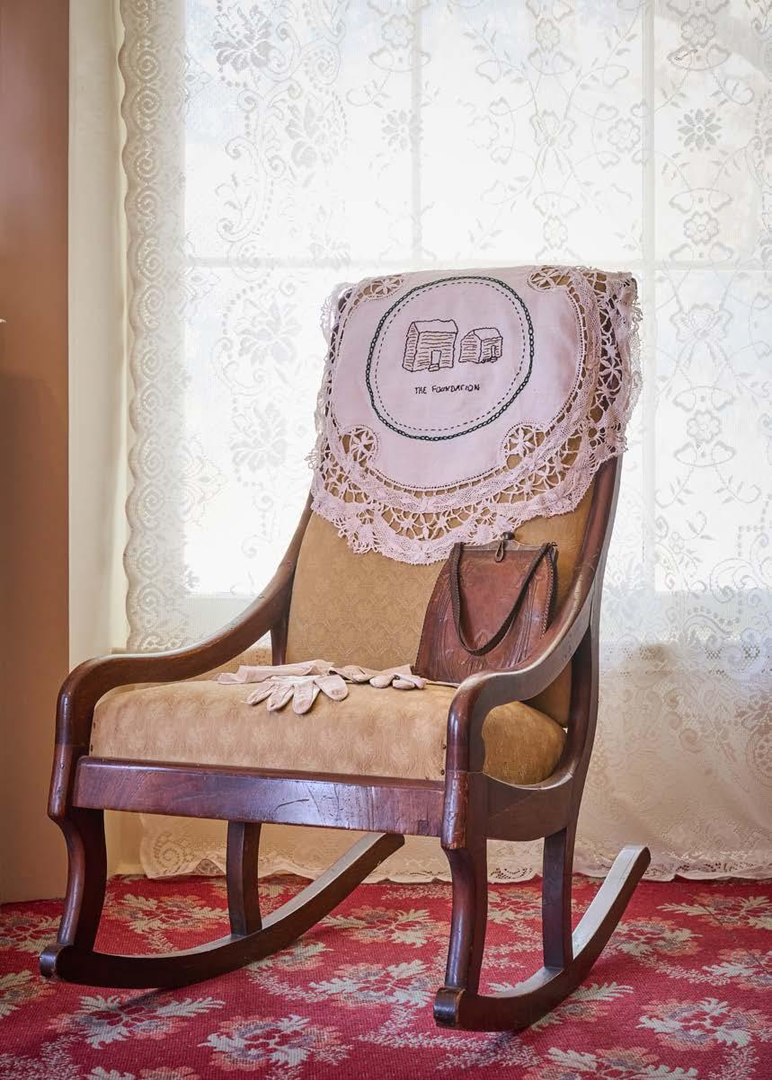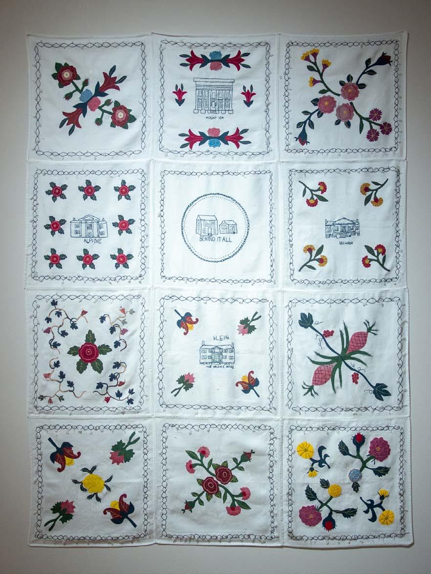 8D The Foundation, 2022. Cotton thread on a found vintage linen, installed with museum artifacts. Photographer Casey Woods. Exhibitions: Neill-Cochran House Museum, Austin TX, 2022.