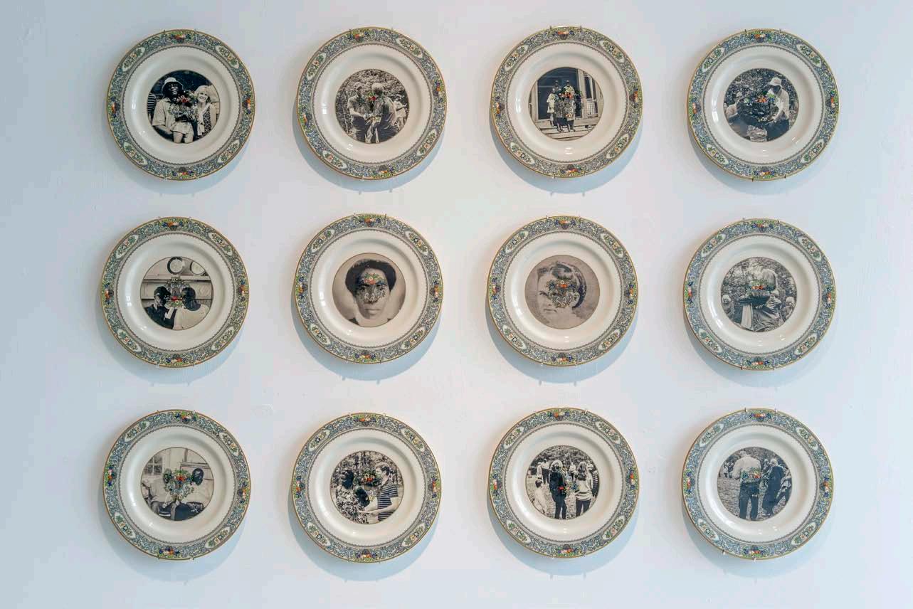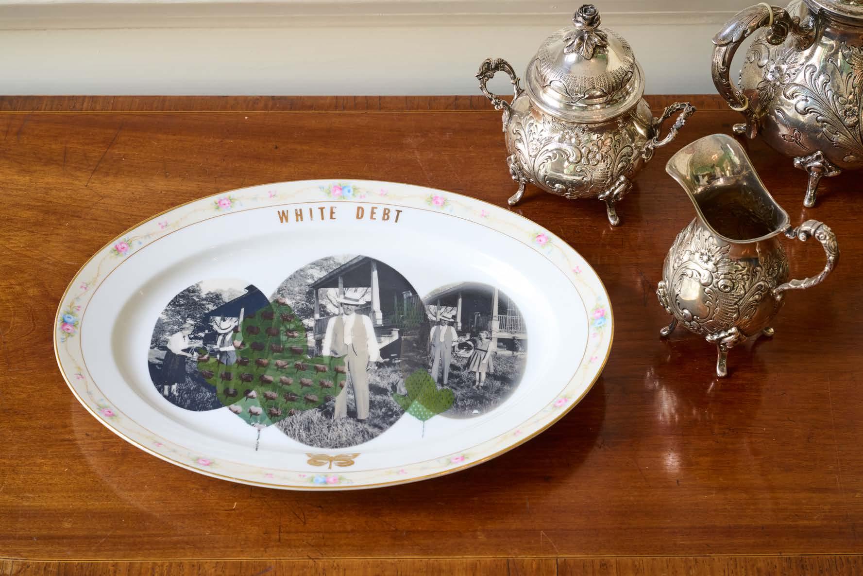 9C The Harvest, 2020. Decals on found “Autumn by Lenox” china. Photographer Nash Baker. Exhibitions: Neill-Cochran House Museum, Austin TX, 2022; Community Artists’ Collective, Houston TX, 2020.