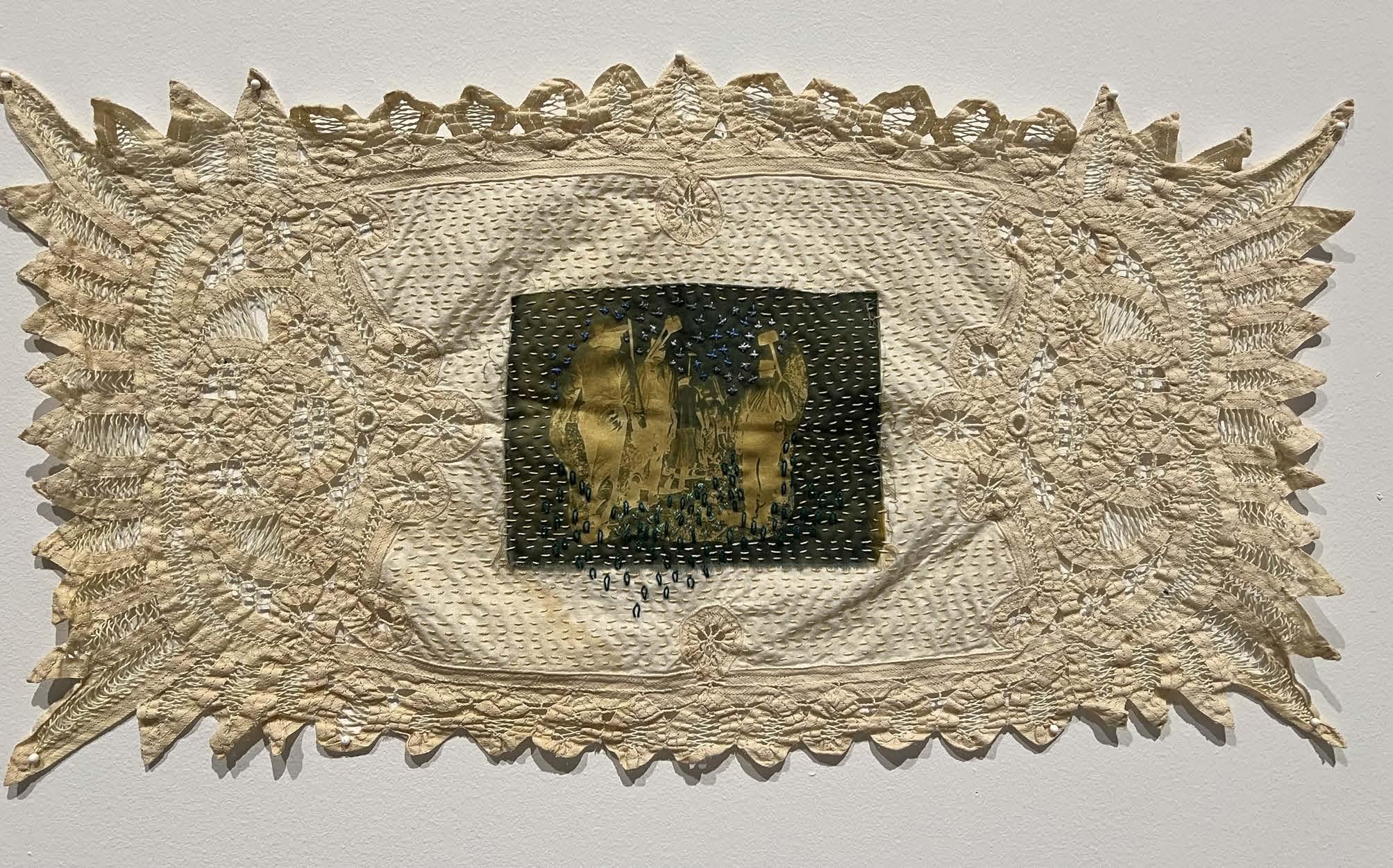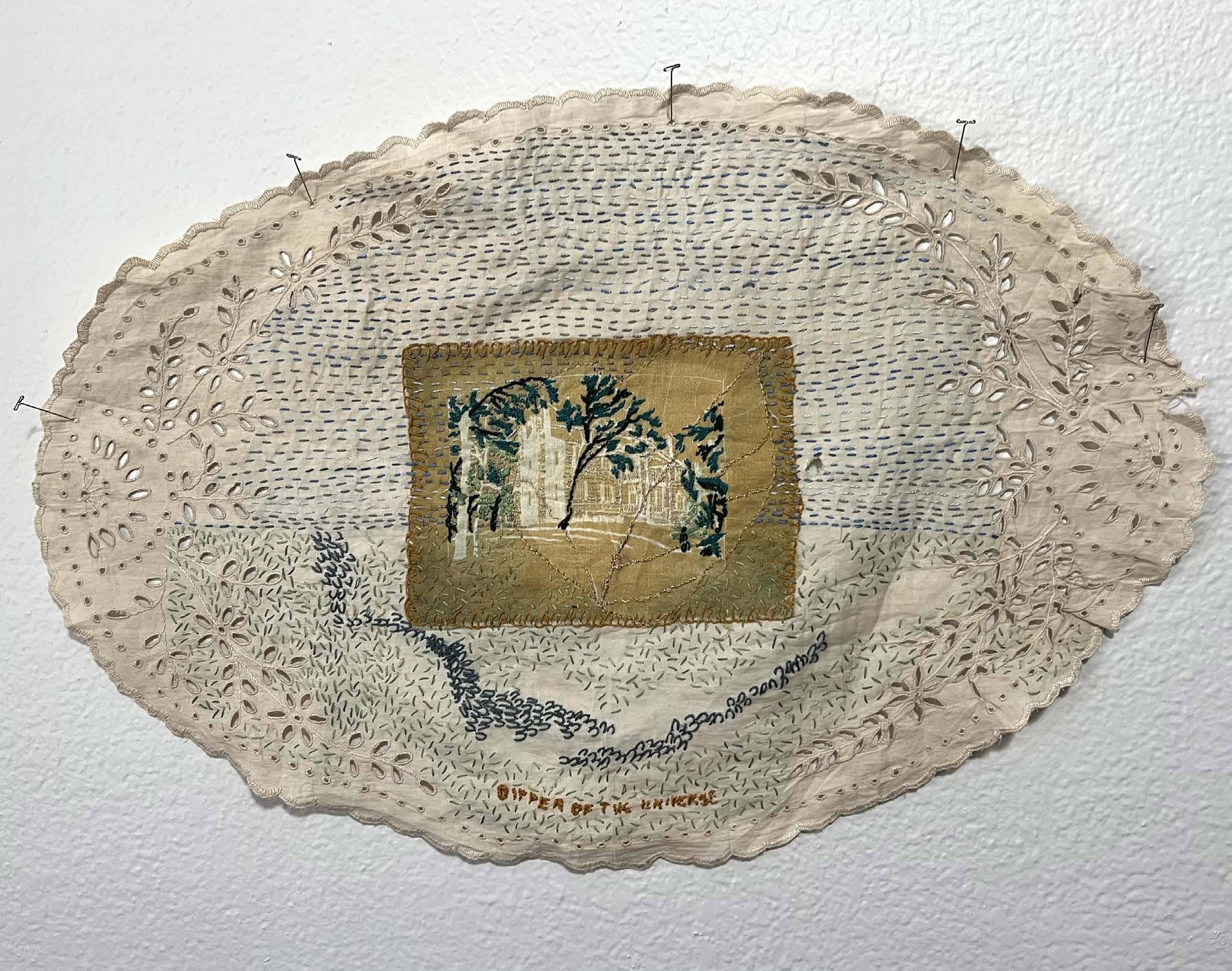 6A Dipper of the Universe, 2022. Cyanotype on cotton and cotton thread on found vintage linen. Photographer Nell Gottlieb. Exhibitions: Arts Revive, Selma AL, 2026.