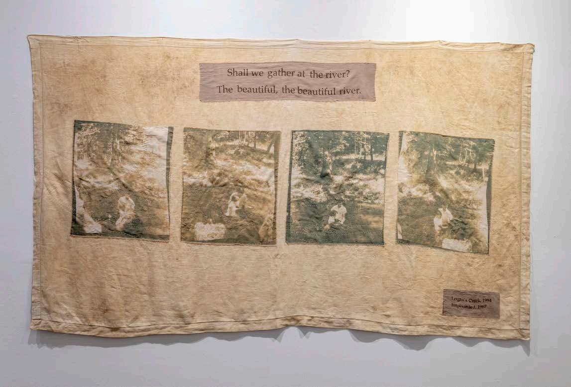 3G Logan’s Creek, 1954, 2025. Cyanotypes and stitching on a vintage table cloth stained from the silt/water of the Lay Lake backwater impounding and erasing Logan Creek, the baptismal site. Original photographs by the artist’s mother, Erin Wallace Harrell, taken in 1954. Photographer Nash Baker. Exhibitions: Gadsden Museum of Art, Gadsden, AL, 2025; Arts Revive, Selma AL, 2026.