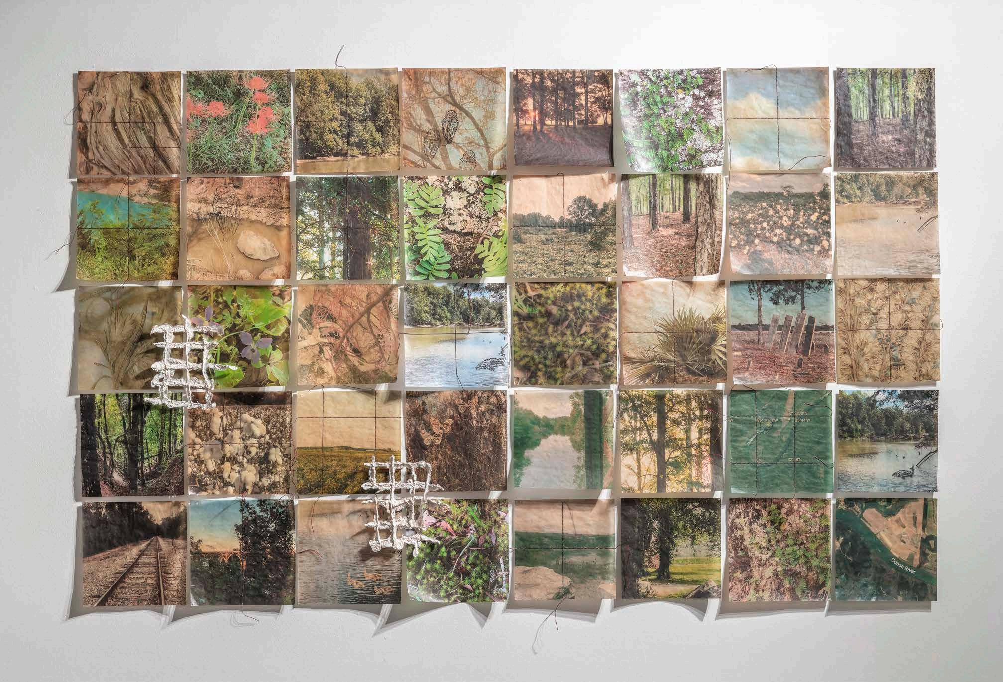 2A Entangled Spaces: Gridded, 2025. Ink jet print on tea-stained paper, thread, acrylic paint, beeswax, cotton paper pulp cast on fishline. Photographer Nash Baker. Exhibitions: Gadsden Museum of Art, Gadsden, AL, 2025
