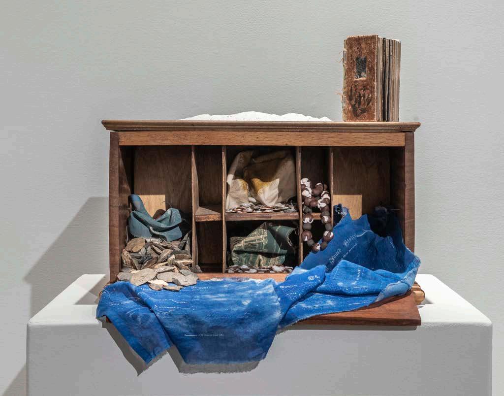 5C The Settler Economy, 2025. Found tabletop desk, Gant Quarry marble dust, artist book, pennies with cotton linter, polymer clay, cyanotype images of land patents on organza, and Native American artifacts from GMA Private Collection. Photographer Nash Baker. Exhibitions: Gadsden Museum of Art, Gadsden AL, 2025.