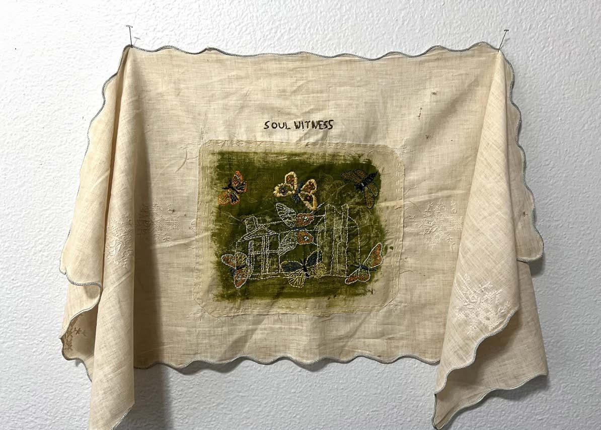 5B Soul Witness, 2021-2025. Anthotype on cotton and cotton thread on found vintage linen. Photographer Nell Gottlieb. Exhibitions: Arts Revive, Selma AL, 2026.