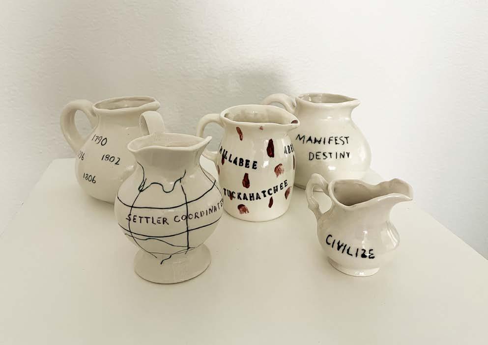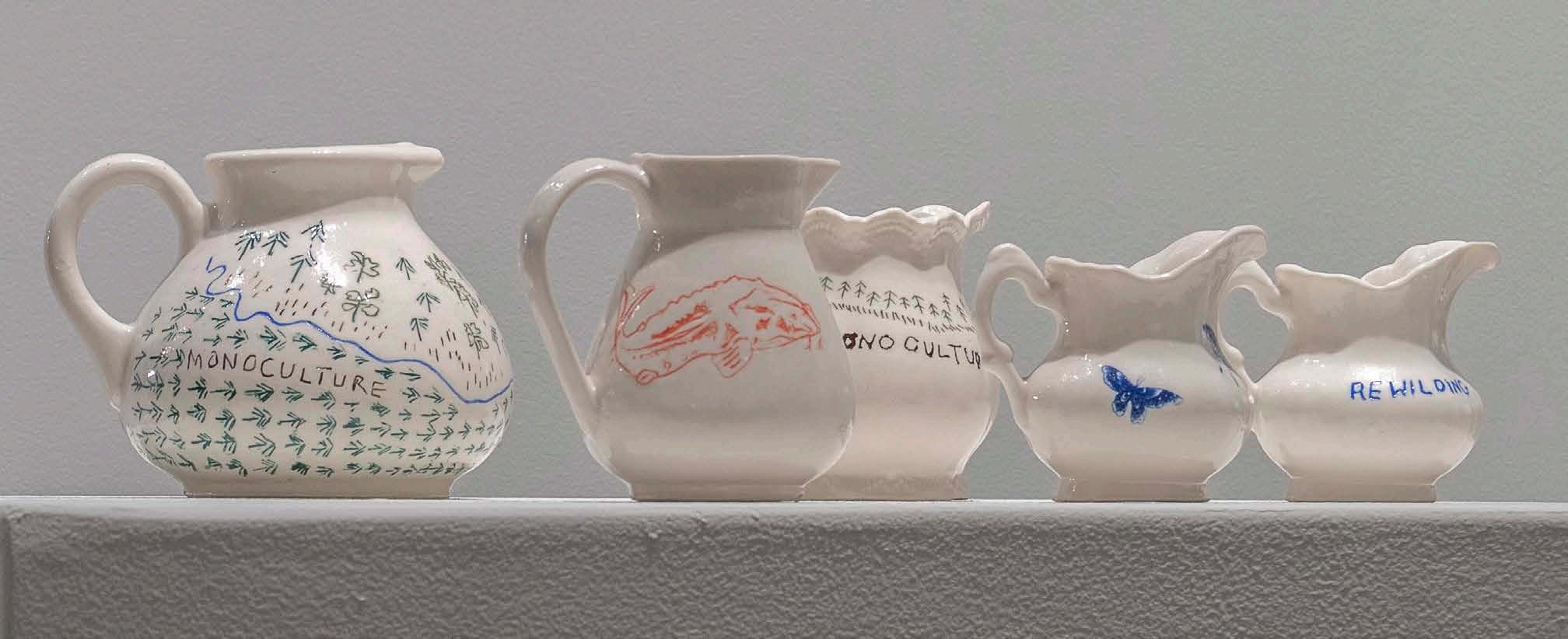 1B De Jure Shatter, 2025. Porcelain slip, underglaze. Photographer Nell Gottlieb. Pitchers from Meander 2: Braided Time exhibited at the Montgomery Museum of Fine Arts, Montgomery AL, 2022.