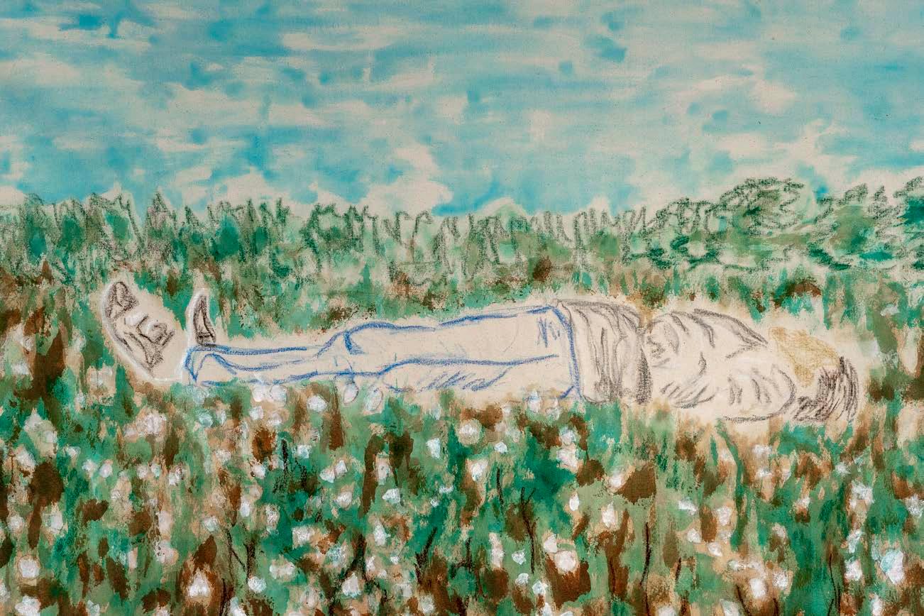 8B Self Portrait in Cotton, 2020. Gouache, oil pastel, and plantation dirt on unstretched canvas. Photographed by Nash Baker. Exhibitions: Neill-Cochran House Museum, Austin TX, 2022; Community Artists’ Collective, Houston TX, 2020.