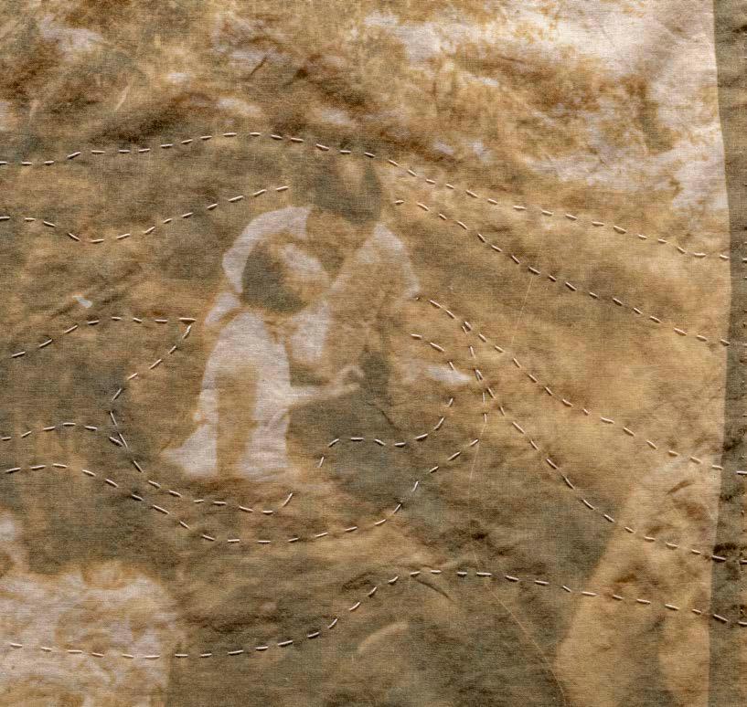 3H Logan’s Creek, 1954, detail, 2025. Cyanotypes and stitching on a vintage table cloth stained from the silt/water of the Lay Lake backwater impounding and erasing Logan Creek, the baptismal site. Original photographs by the artist’s mother, Erin Wallace Harrell, taken in 1954. Photographer Nash Baker. Exhibitions: Gadsden Museum of Art, Gadsden, AL, 2025; Arts Revive, Selma AL, 2026.
