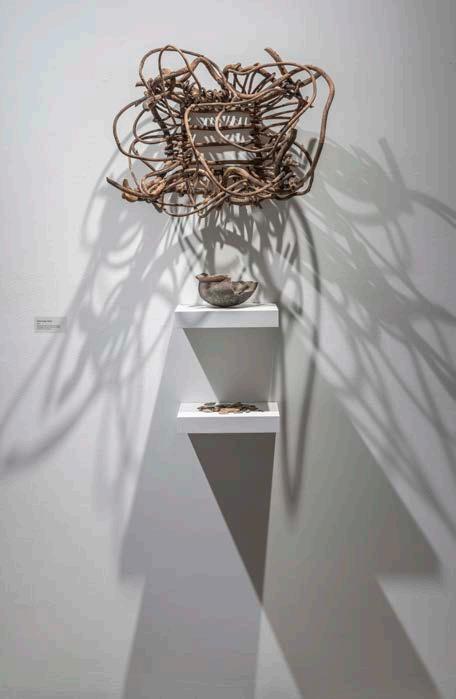 1D What Kudzu Hides, 2025. Kudzu basket made by Andrew McCall and purchased in Marengo County, torched with map gas, Native American artifacts from GMA Private Collection. Photographer Nash Baker. Exhibitions: Gadsden Museum of Art, Gadsden, AL, 2025.