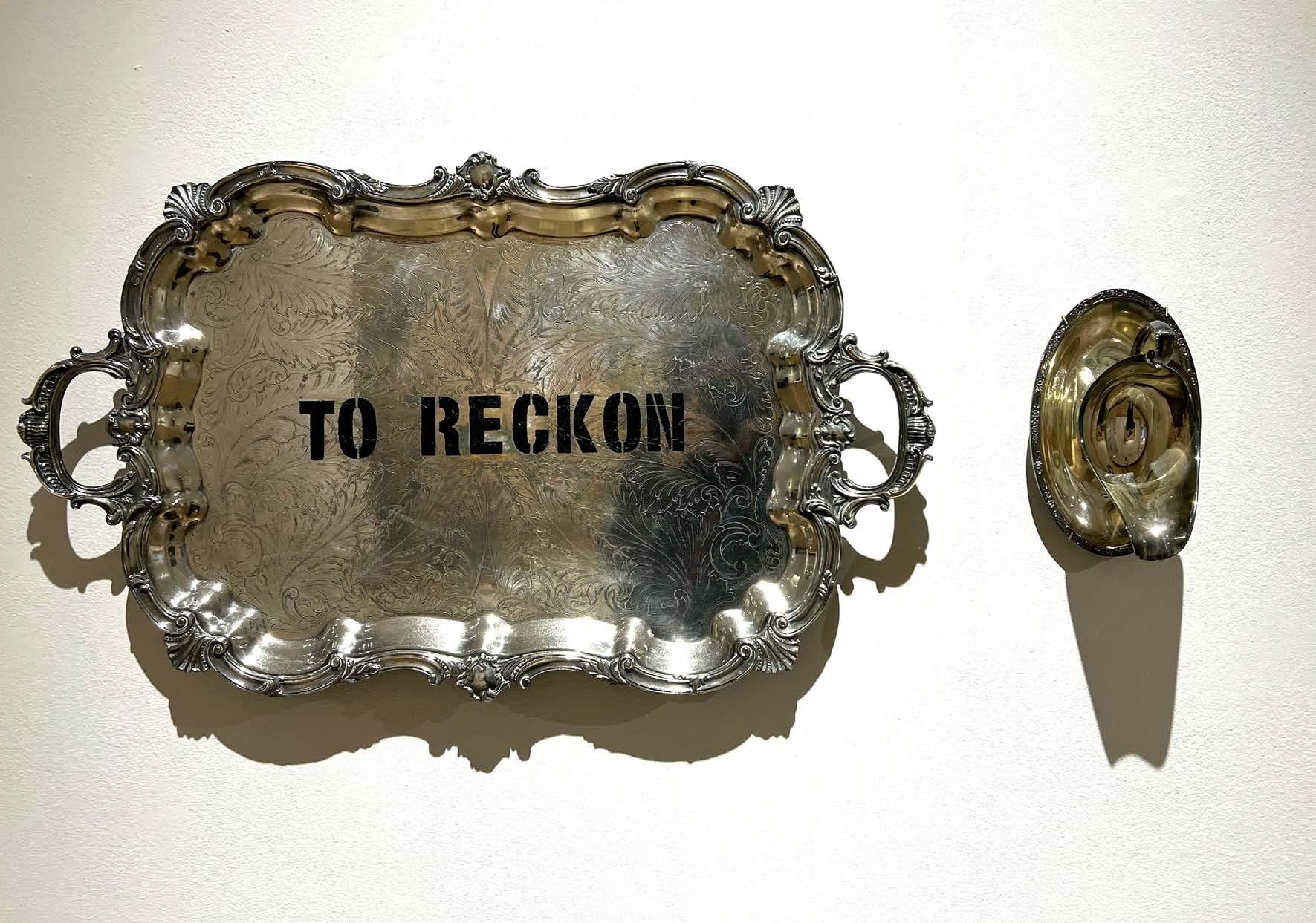 8F To Reckon, 2021. Acrylic stencil on found silverplate. Photographer Nell Gottlieb. Exhibitions: Montgomery Museum of Fine Arts, Montgomery AL, 2022