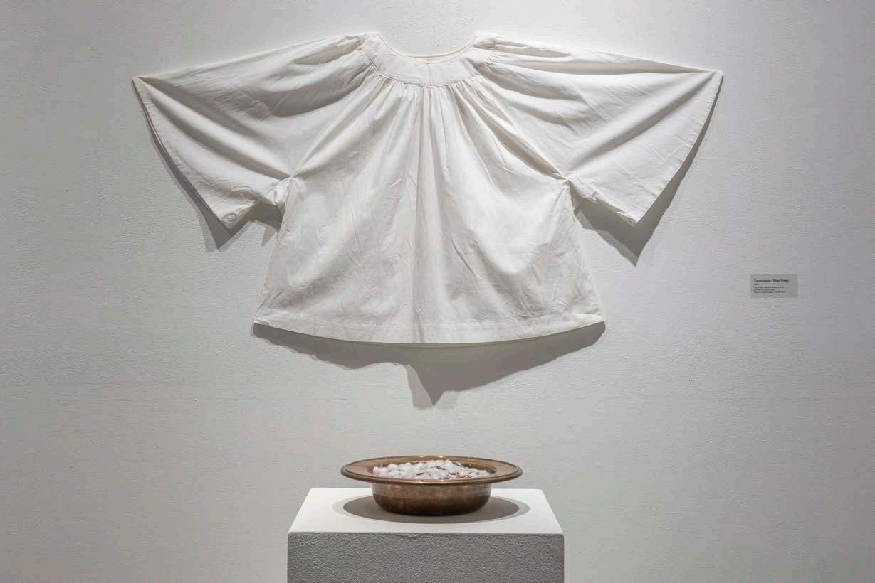 4B Transmutation Blood Money, 2021. Found choir robe and collection plate, pennies with cotton fiber. Photographer Nash Baker. Exhibitions: San Angelo Museum of Fine Arts, 2021; Montgomery Museum of Fine Arts, Montgomery AL, 2022; Gadsden Museum of Art, Gadsden, AL, 2025