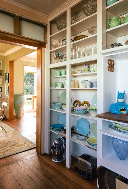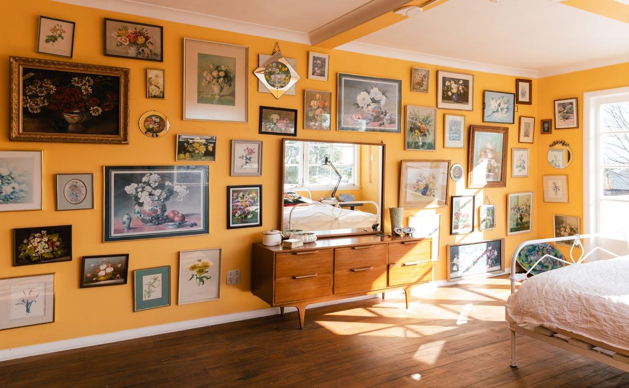 1. As a ceramic artist, Kirsten’s home features many pieces of her art. The birds are part of her ‘Dawn Silence’ series. 2. Norton enjoys sitting in the sun looking out over the garden. 3. Kirsten makes the most of the sunlight in the living room and frequently rearranges the furniture to suit the time of year. 4. The open kitchen shelving features Kirsten’s colourful ceramic pieces. 5. It’s no wonder Kirsten’s favourite room of the house is her bright and sunny bedroom, with her impressive collection of flower paintings on the walls.
