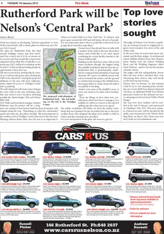 Nelson as Central Park is to New York City. “It will give vital green space around the CBD and will attract all sorts of people. The judges of Nelson's Love Stories competiWork has started on developing “Nelson’s equivalent” to New It is very important, that is why we would like to hear from local tion are looking forward to judging the reYork’s Central Park, with a master plan now drawn up, says Nel- people about what they want there.” gion's most romantic love story at the end son City Council. Council says it has already been in talks with CUSTOMER CARS R US - RUSSELL PINK PUBLISHING 18/08/11 of this week. The plan for Rutherford Park, the land a number of the clubs in the area about their SALES REP S.POWELL PUBLICATION LEADER NELSON So far more than 20 stories have been subaround Trafalgar Centre, has been develfuture, and would like to see some sports ADVERTISING DESIGNER Vlienert SECTION RUNmitted, OF PRESS and the three judges - local diamond oped but council says it is by no means set PROOF combining for a joint facility, simular to the PROOFED 8/16/2011 9:35:33 AM SIZE 8.00 X 4.0 expert Halfdan Hansen from Jens Hansen, in concrete and they would like to hear from Saxton Field model. AD ID 3814627AE FAX Jenny Walton from the Nelson Wedding ratepayers about what they would like to see Building on the land does come with several Show, and My Wedding Magazine editor in the area. NCC will host a workshop on the major problems though, the biggest being PLEASE APPROVE THIS AD AS SOON AS POSSIBLE. NOTE THAT ANY ALTERATIONS Gayle Dickson - need to choose the top nine 26 and 27 of this month providing people an the unstable foundation that the area sits on. romantic stories. MUST BE FINALISED BY OUR MATERIAL DEADLINE. opportunity to have their say. Rutherford Park is predominantly underThe judges will first independently choose The area is seen as key, strategically, by counlain by reclaimed land identified as hard and their top nine stories, and then after cross cil as it will provide green space linking the domestic fill. Layers of rubbish mixed with referencing their choices, they will decide CBD to the waterfront. Among the proposed soil are beneath the surface and the ground on the final top nine stories. additions to the area will more walkways, is continuously moving as the rubbish layers Entries close on January 14, and entrants parks, improved access to Trafalgar Centre decompose below it. It also means the land is could be in to win amazing prizes includand car parking. susceptible to flooding. ing one of nine $600 Jens Hansen diamond The redevelopment will mean major changes Andrew says some of the landfill is toxic so vouchers, an additional $1000 Jens Hansen for some clubs in the area including some extra care needs to be taken when developdiamond voucher for the ultimate love stothat may need to move location, including ing it. ry, and gorgeous flowers from Willow Floral possibly the Marist Rugby Club and Nelson The proposed redevelopment of “Those are things we have taken into conRutherford Park. The red buildDesign. Rifle Club. sideration, about how best to manage it. It is The nine love story finalists will be notiNCC Parks and recreation manager Andrew ing on the left is the Trafalgar unlikely we will try to remove it, the risk of it fied at the end of January, and announced Petheram says the project will be a long- Centre. spilling into the waterways is too great.” on Valentine's Day 2012. The most romanterm one, similar to how Saxton Field has been developed, with The public workshops will follow on from the similar worktic Nelson love story will be decided by the changes along the way. “Depending on what the community’s shops that were planned for late December, but due to the poor public and announced at the Nelson Wedneeds and wants are, this plan is flexible. The redevelopment of weather those who designed the plans were unable to land in ding Show on May 6, 2012. Enter your love the northern end of Trafalgar Centre [this year] is the first step.” Nelson and the meetings were cancelled. story today at www.jenshansen.com. Planning advisor Britta Hietz says the area is as important to For more information on the plan visit www.ncc.govt.nz.