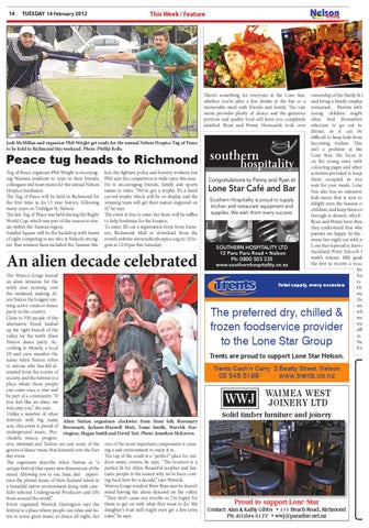 The Wairoa Gorge hosted an alien invasion for the tenth year running over the weekend, making Alien Nation the longest running active outdoor dance party in the country. Close to 350 people of the alternative breed landed up the right branch of the valley for the tenth Alien Nation dance party. According to Moxely, a local DJ and crew member the name Alien Nation refers to anyone who has felt alienated from the norms of society, and the festival is a place where those people can come once a year and be part of a community. “If you feel like an alien, we welcome you,” she says. Unlike a number of other festivals with big name Alien Nation organisers clockwise from front left; Rosemary acts, this event is proud of Brownsett, Jackson-Maxwell Moti, Tomo Smith, Warrick Harunderground music. Psy- rington, Megan Smith and David Tait. Photo: Jonathan McKeown. chedelic trance, progressive, minimal and Techno are just some of the one of the most important components is creatgenres of dance music that featured over the four ing a safe environment to enjoy it in. The top of the south is a “perfect” place for outday event. The organisers describe Alien Nation as “a door music events, he says. “The location is a unique festival that opens new dimensions of the perfect fit for Alien. Beautiful weather and fanmind. Allowing you to see, hear, feel - experi- tastic people is the reason why we’ve been comence the primal music of New Zealand talent in ing back here for a decade,” says Warrick. a beautiful native environment along with care- Wairoa Gorge resident Peter Russ says he doesn’t fully selected Underground Producers and DJs mind having the aliens descend on the valley. “They don’t cause any trouble so I’m happy for from around the world”. Event organised Warrick Harrington says the them to get on with what they want to do. My festival is a place where people can relax and lis- daughter’s fruit stall might even get a few extra ten to some great music or dance all night, but sales,” he says.
