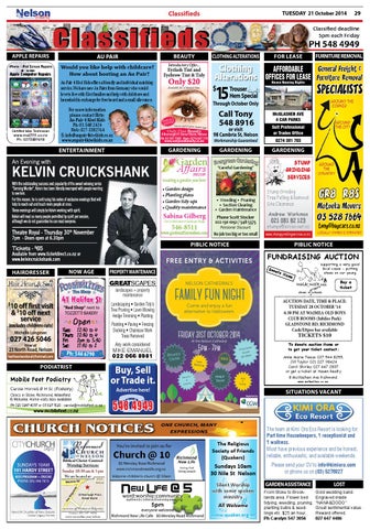 AUCTION DATE, TIME & PLACE: TUESDAY 28 OCTOBER ‘14 6.30 PM AT WAIMEA OLD BOYS CLUB ROOMS (Jubilee Park) GLADSTONE RD, RICHMOND Cash/Eftpos bar available