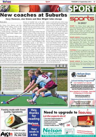 Phillip Rollo Joe Green, Cary Hamson and Ben Wright will be taking control of the coaching reigns at Nelson Suburbs next year, with the latter also forming a mouth-watering combination with Waitakere United striker Gagame Feni on the pitch. Joe, a former Richmond Athletic captain, Ben, and Cary, who was involved in the coaching staff at Richmond for 13 years, were officially announced by club president Jason Lavington this week and take over the role formerly vacated by John Slotemaker and Paul Brydon. Ben played professionally in England and Norway up until 2010 and his career is highlighted by a goal at Stamford Bridge against Chelsea in the UEFA Cup with Viking FK. Ben is likely to play a key role up front for the Robbie’s Premier League runners-up, as well as in a coaching role, while Joe is also planning on lacing up the boots for a game or two. Joe and Ben will both operate in a paid