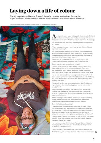Laying down a life of colour A family tragedy turned Lynette Graham’s life and art practice upside down. But now the Mapua artist tells Charles Anderson how she hopes her work can still make a small difference. Lynette Graham was inspired by the idea of having ‘useable art’ that was bursting with colour.