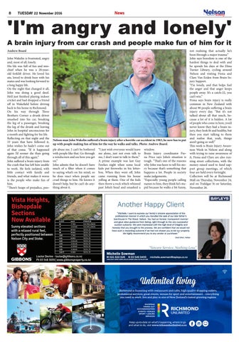 not realising that actually he’s been through a major trauma.” John says boredom is one of the hardest things to deal with and he spends his days at the Elma Turner Library, cycling around Nelson and visiting Fiona and Clare Van Eeden from Brain Injury Support. “I’m lonely, and that helps fuel the anger and that anger keeps people away. It’s a catch-22, you can’t win.” Fiona says brain injury is really common in New Zealand with about 90 people suffering a brain injury every day. “But it’s not talked about all that much, because a lot of it is hidden. A lot of people who come in here, you’d never know they had a brain injury, they look fit and healthy, but then you start talking to them and realise that, yeah, things aren’t going so well.” This week is Brain Injury Awareness Week in Nelson and along with trying to raise awareness of it, Fiona and Clare are also running street collections, with the money raised used to fund support group meetings, of which four are held every fortnight. Collectors will be at Richmond Mall on Thursday, November 24, and on Trafalgar St on Saturday, November 26.