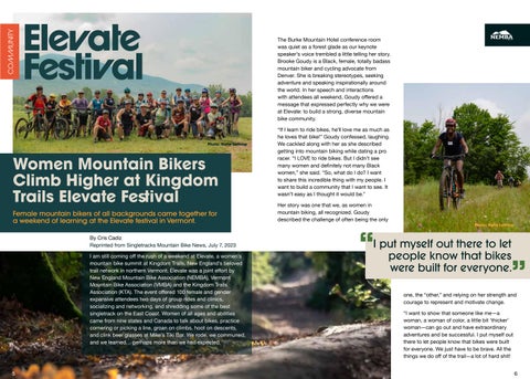 Women Mountain Bikers Climb Higher at Kingdom Trails Elevate Festival Female mountain bikers of all backgrounds came together for a weekend of learning at the Elevate festival in Vermont. By Cris Cadiz Reprinted from Singletracks Mountain Bike News, July 7, 2023 I am still coming off the rush of a weekend at Elevate, a women’s mountain bike summit at Kingdom Trails, New England’s beloved trail network in northern Vermont. Elevate was a joint effort by New England Mountain Bike Association (NEMBA), Vermont Mountain Bike Association (VMBA) and the Kingdom Trails Association (KTA). The event offered 100 female and gender expansive attendees two days of group rides and clinics, socializing and networking, and shredding some of the best singletrack on the East Coast. Women of all ages and abilities came from nine states and Canada to talk about bikes, practice cornering or picking a line, groan on climbs, hoot on descents, and clink beer glasses at Mike’s Tiki Bar. We rode, we communed, and we learned… perhaps more than we had expected.