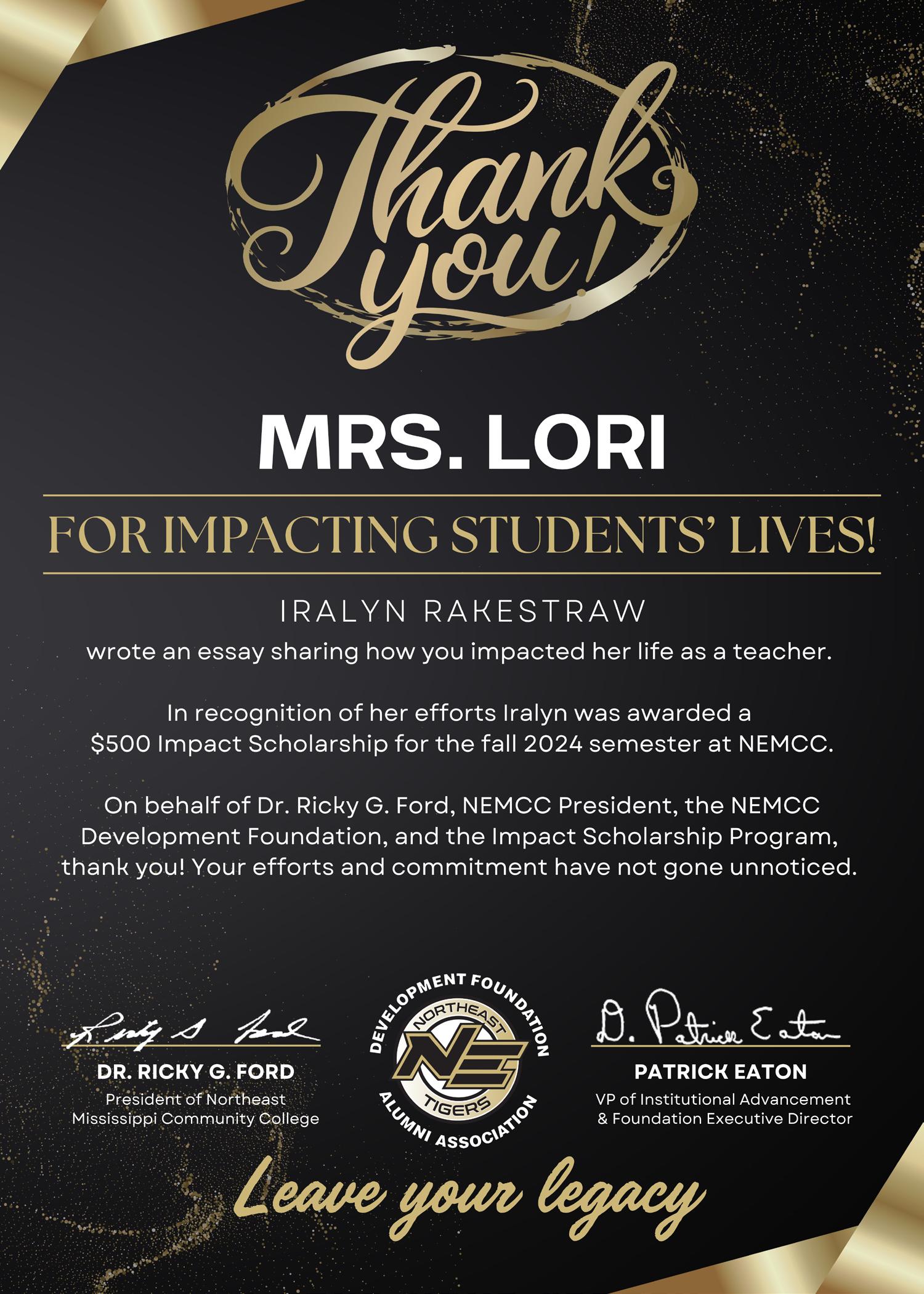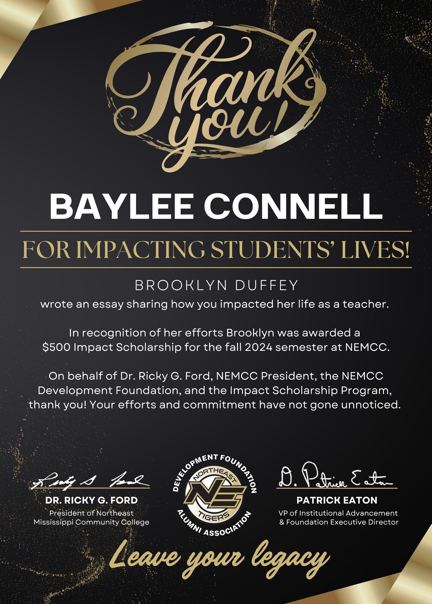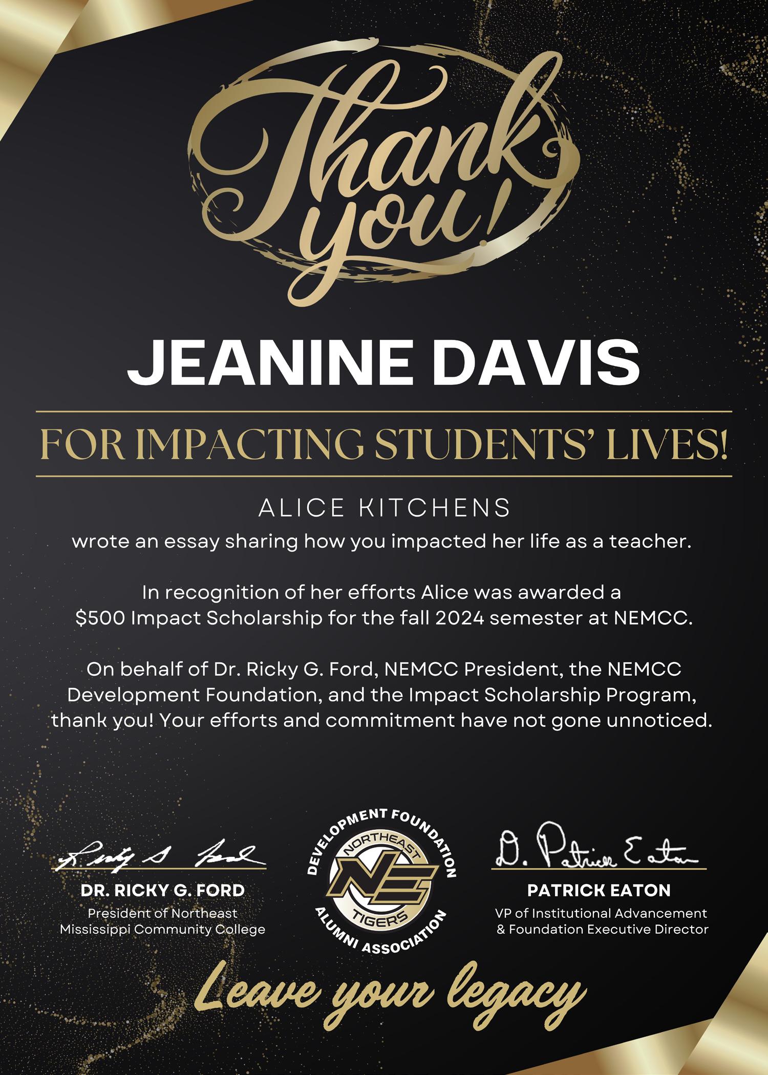 Thanks to a generous gift the Northeast Mississippi Community College Development Foundation & Alumni Association was able to create a new scholarship program named the IMPACT Scholarship Program. The goal of this program is to recognize the incredible influence teachers have on their students’ lives. In order to qualify for the scholarship, students had to write a 300 to 500 word essay that honors the teacher or professor who made the most significant impact on their life. The Foundation held a luncheon to present a $500 scholarship for both the fall and spring semester and honor the teachers who inspired their essays.