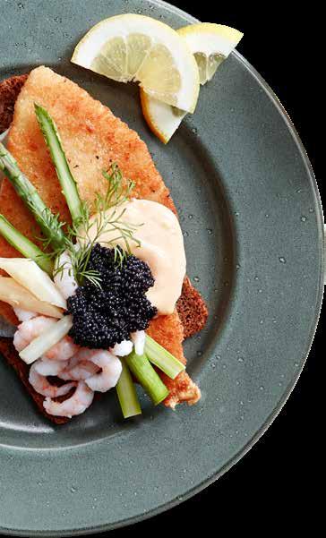 Torskeloin med rustik sennepssauce, hertil savoykål, sprød bacon, ristede hasselnøddeflager og gremolata af frisk persille, skalotteløg og syrlig citronskal.