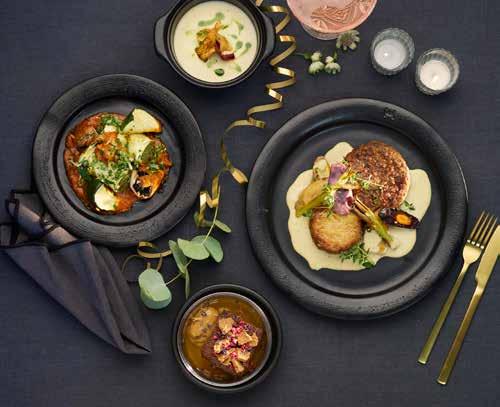 Vegansk juicy bøf lavet på rødbeder og svampe, serveret med karl johansauce, pommes fondant, tre slags gulerødder, springløg og gramolata af grønkål, skalotteløg og syrlig citronskal.