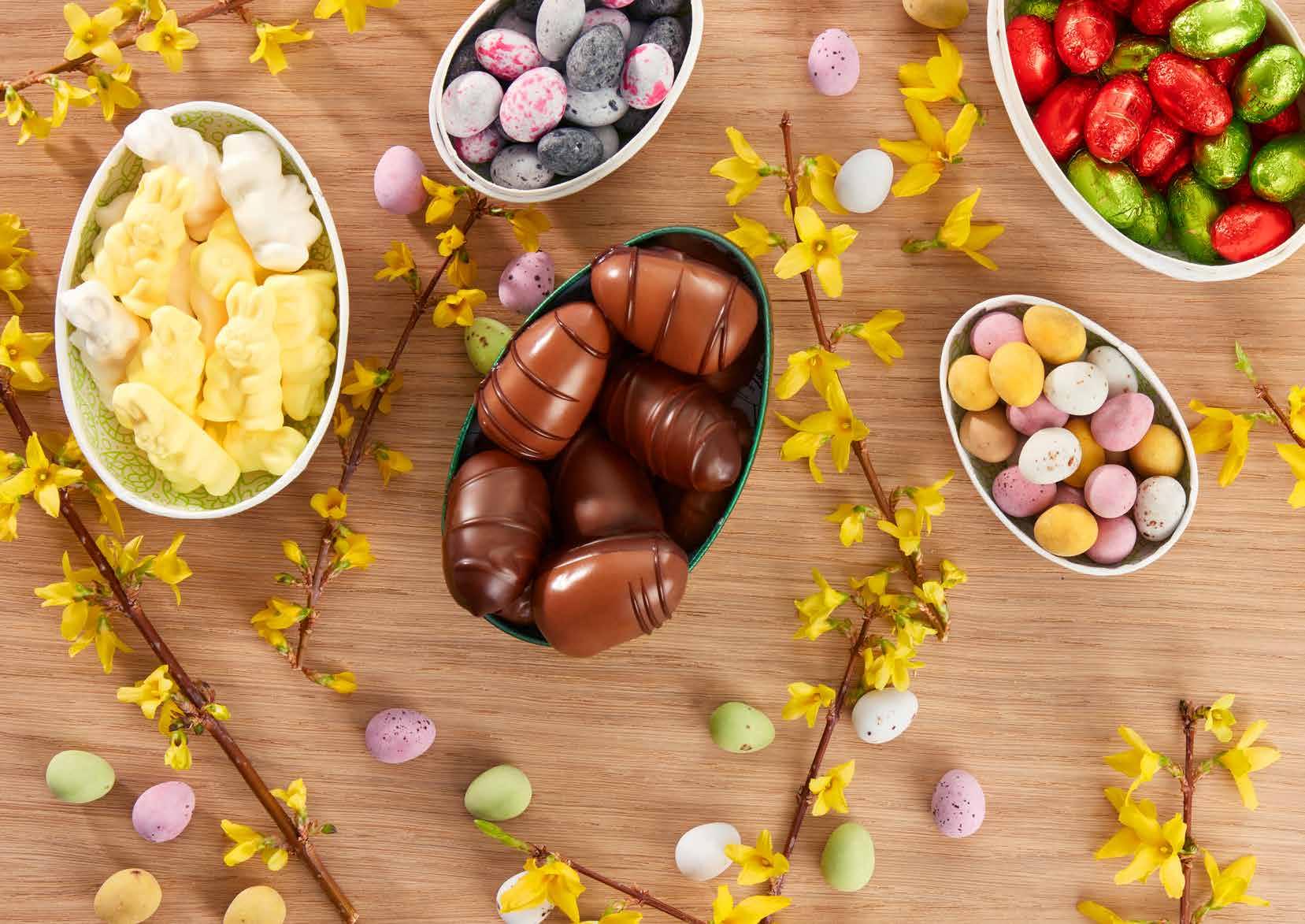 Du finder også smukke blomster, pynt og slik til at bringe foråret og påskestemningen ind i virksomheden.