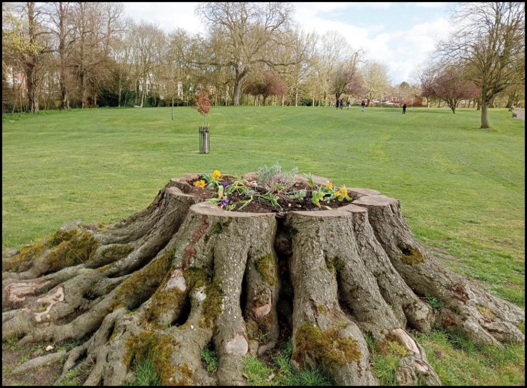 Thestumpitselfwasconvertedintoaraised flowerbed.Arangeofflowerswereplantedinit. Unfortunately,vandalshavenowpulledupthe biggerones,leavingjusttheflowersthatare showninthephotograph.