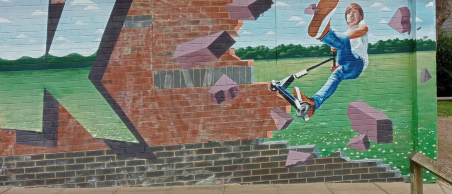 Theeasternwallofthebuildingisanotheractionimage.Itshowstwoskateboarderscrashingthrough thewall,andagirlonabicycleridingintothesunset.