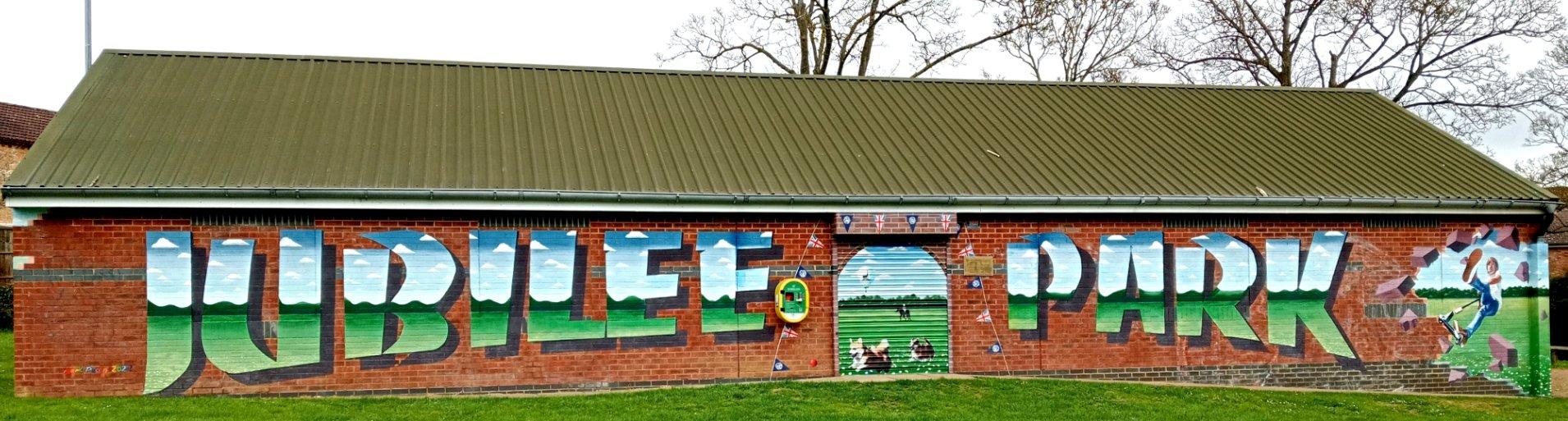 JubileeParkâschangingroomsareaworkofart.Theoutsidewallsareariotofcolour,depicting skateboarders.