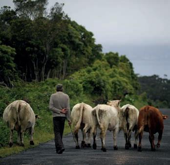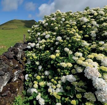 Dall’alto in senso orario si torna in paese con le mucche sull’isola di Pico. Terre alte sulle pendici del vulcano di Pico. Siepi di ortensie delimitano le proprietà. Fiori azzurri di Agapanthus.