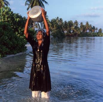 Nella pagina accanto, una donna fuma il narghilé nell’isola Rakeedhoo, atollo Felidhoo. In basso, dall’alto in senso orario, piccola spiaggia di Rakeedhoo, reef corallino dell’isola Ambaraa atollo Felidhoo. Una ragazza si fa la doccia con un secchio, pescatori a Suvadiva.