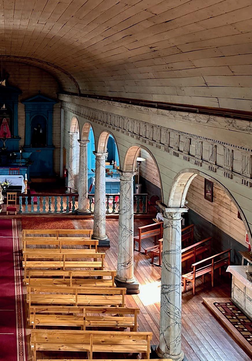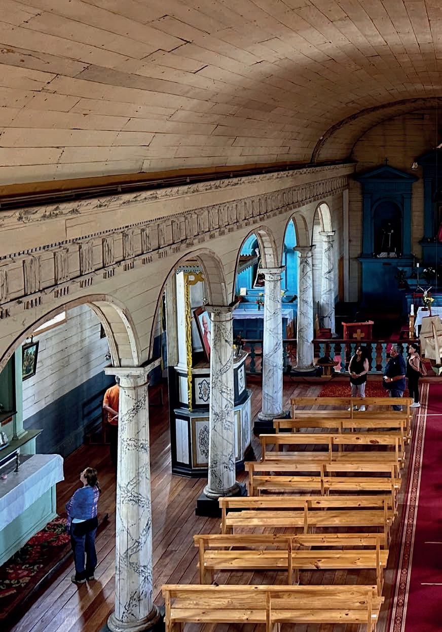 Nella pagina accanto, una sala del Museo di Arte Moderna a Castro. In basso, la chiesa di Conchi. Nelle pagine seguenti, interni di Nercón, una delle sedici chiese Patrimonio Mondiale Unesco.
