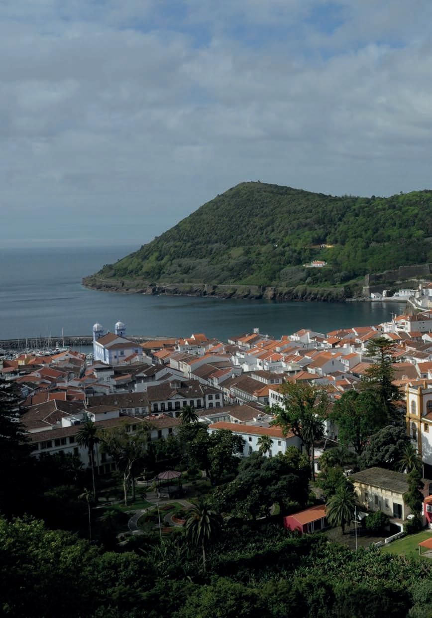 In alto, il borgo raccolto nelle mura di Porto Pim sull’isola di Horta, molto amato dallo scrittore Antonio Tabucchi.