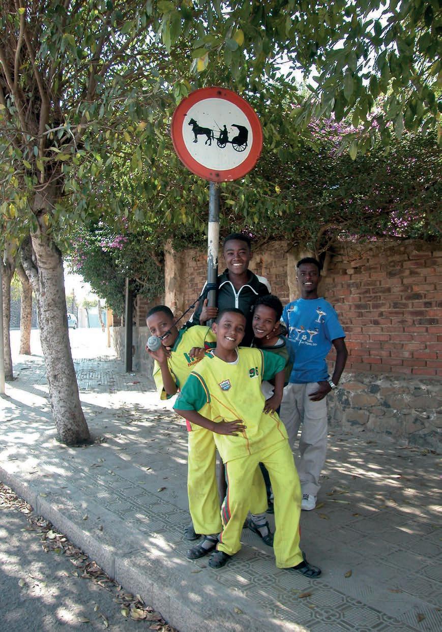 Il gioco del calcio alla pallina in un viale di Asmara.