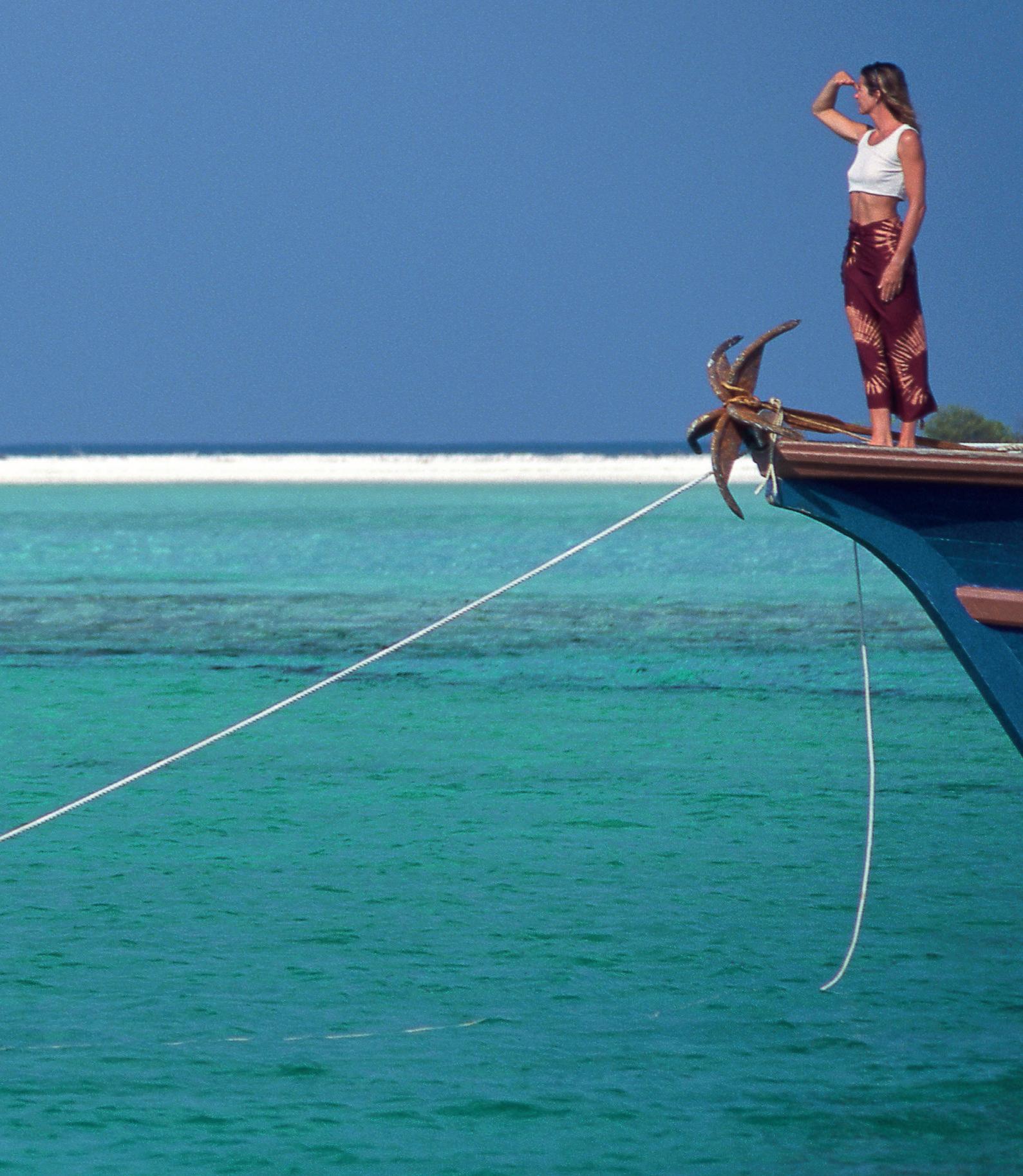 Sulla tolda della barca all’isola Maarehaa, atollo Suvadiva.