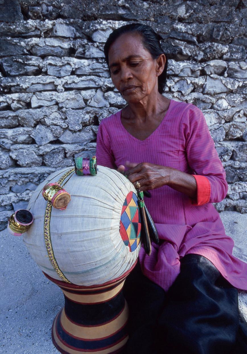 Una donna lavora al tombolo nell’isola Villingili, atollo Suvadiva.