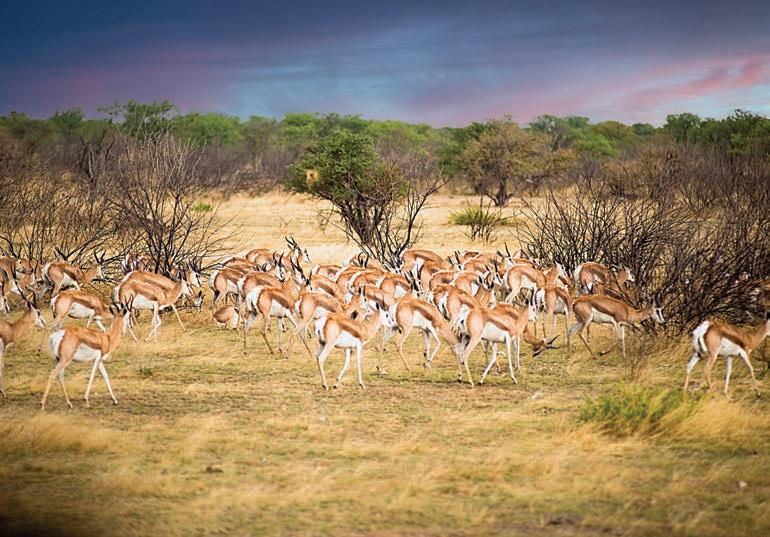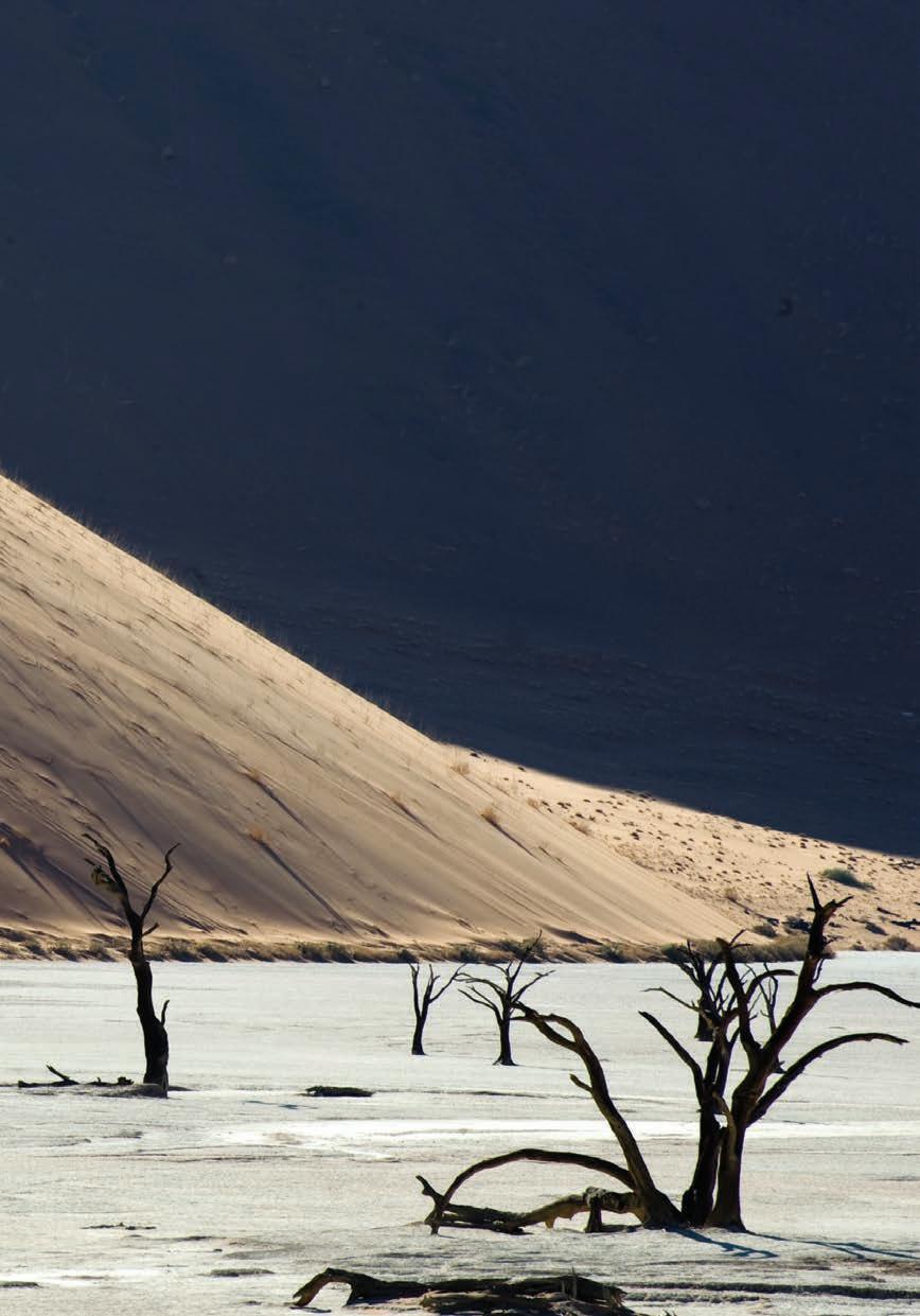 La Duna 45, a 45 km da Sesriem, sulla strada per Sossusvlei, nel Parco Nazionale Namib-Naukluft. Deadvlei nel Sossusvlei, una depressione dal suolo argilloso, con alberi morti di acacia che si stagliano contro il cielo. In basso e nella pagina accanto, alcuni degli animali che s’incontrano lungo le strade della Namibia. In basso e nella pagina accanto: una giornata con i Boscimani, antichi abitanti del deserto, noti anche come San, nel deserto del Kalahari.