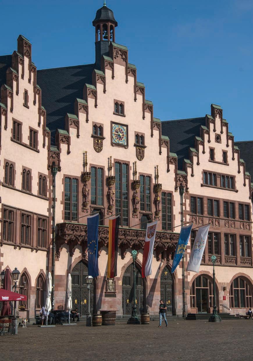 riferimento al fiume Meno (Main in tedesco) e alla città americana. Basta scendere a livello strada e camminare lentamente per scoprire un volto inaspettato. Mercatini e negozi multietnici, spazi verdi, quartieri vivaci, un’anima multiculturale accogliente e una qualità di vita invidiabile. Tutte le stradine confluiscono in piazza Romerberg, centro storico di Francoforte. Seppur ricostruito pietra su pietra con un’attenzione quasi maniacale al dettaglio, dopo i massicci bombardamenti della Seconda Guerra mondiale, conserva intatto il fascino e l’atmosfera medievale. Le case a graticcio dai colori pastello, la bella fontana con la scultura bronzea della Giustizia si affacciano sulla vasta piazza, cuore pulsante della città vecchia. Qui si trova il Romer, lo storico municipio cittadino, e qualche via più in là il Duomo imperiale di San Bartolomeo, dove venivano incoronati gli imperatori del Sacro Romano Impero. Tutto intorno è un groviglio