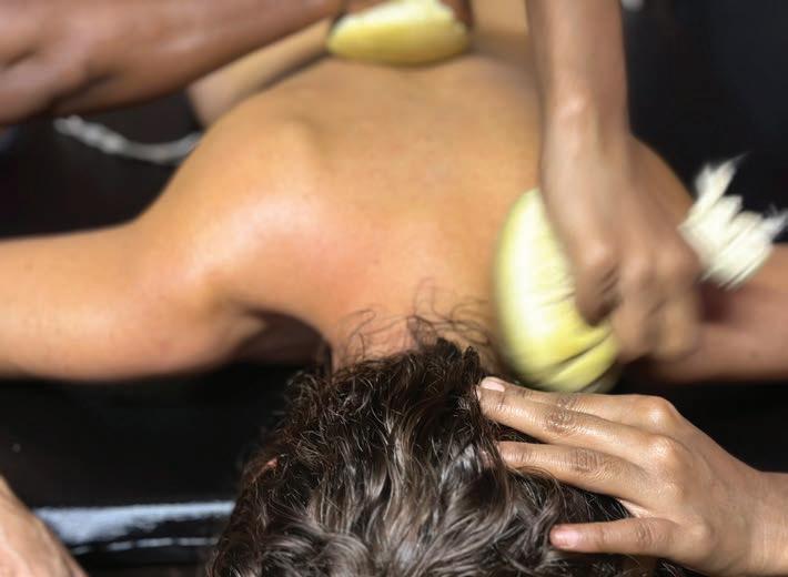 Nelle pagine seguenti, a sinistra, tamponi per trattamento cervicale. A destra, “shirodara” flusso continuo di olio sulla fronte per favorire rilassamento e benessere mentale.